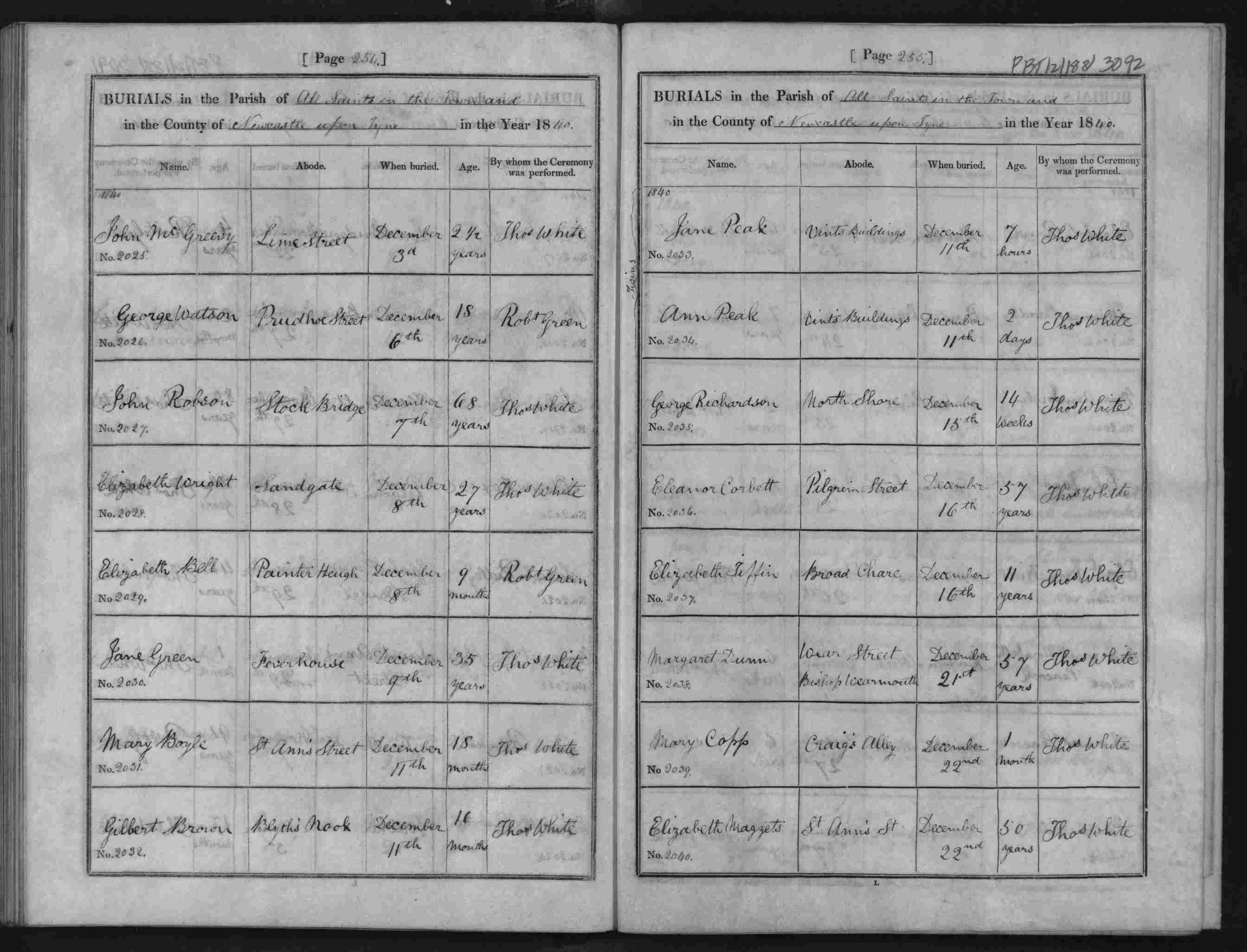 Bishop's Transcripts for the Diocese of Durham, England; Burial entry for Ann Peak, Newcastle All Saints, 11 Dec 1840, Page 255, No 2034.