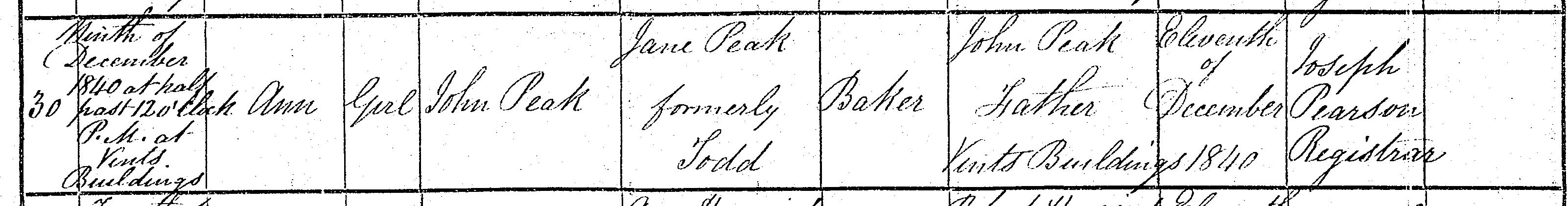Birth in the Registration District of Newcastle Upon Tyne, Northumberland, 1840, no. 30. Born 9 Dec 1840 at Vints Buildings; Ann Peak; Girl; father John Peak; mother Jane Peak, formerly Todd. Occupation of father: Baker. Informant was John Peak; Father; Vints Buildings; signed name. The birth was registered 11 Dec 1840. Born at half past 12 o'clock PM