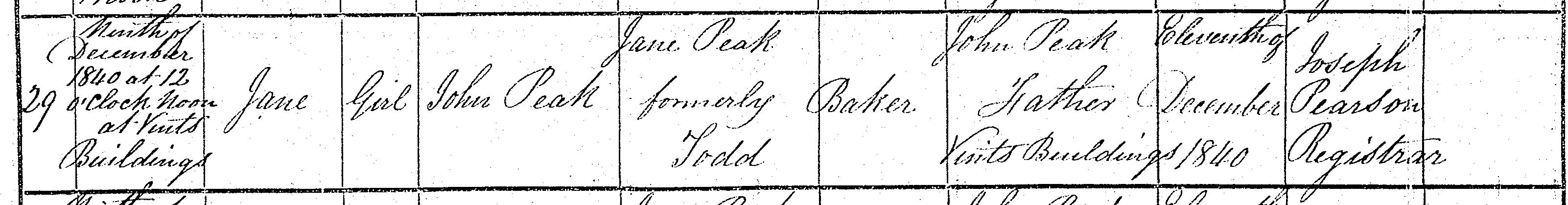Birth in the Registration District of Newcastle Upon Tyne, Northumberland, 1840, no. 29. Born 9 Dec 1840 at Vints Buildings; Jane Peak; Girl; father John Peak; mother Jane Peak, formerly Todd. Occupation of father: Baker. Informant was John Peak; Father; Vints Buildings; signed name. The birth was registered 11 Dec 1840.