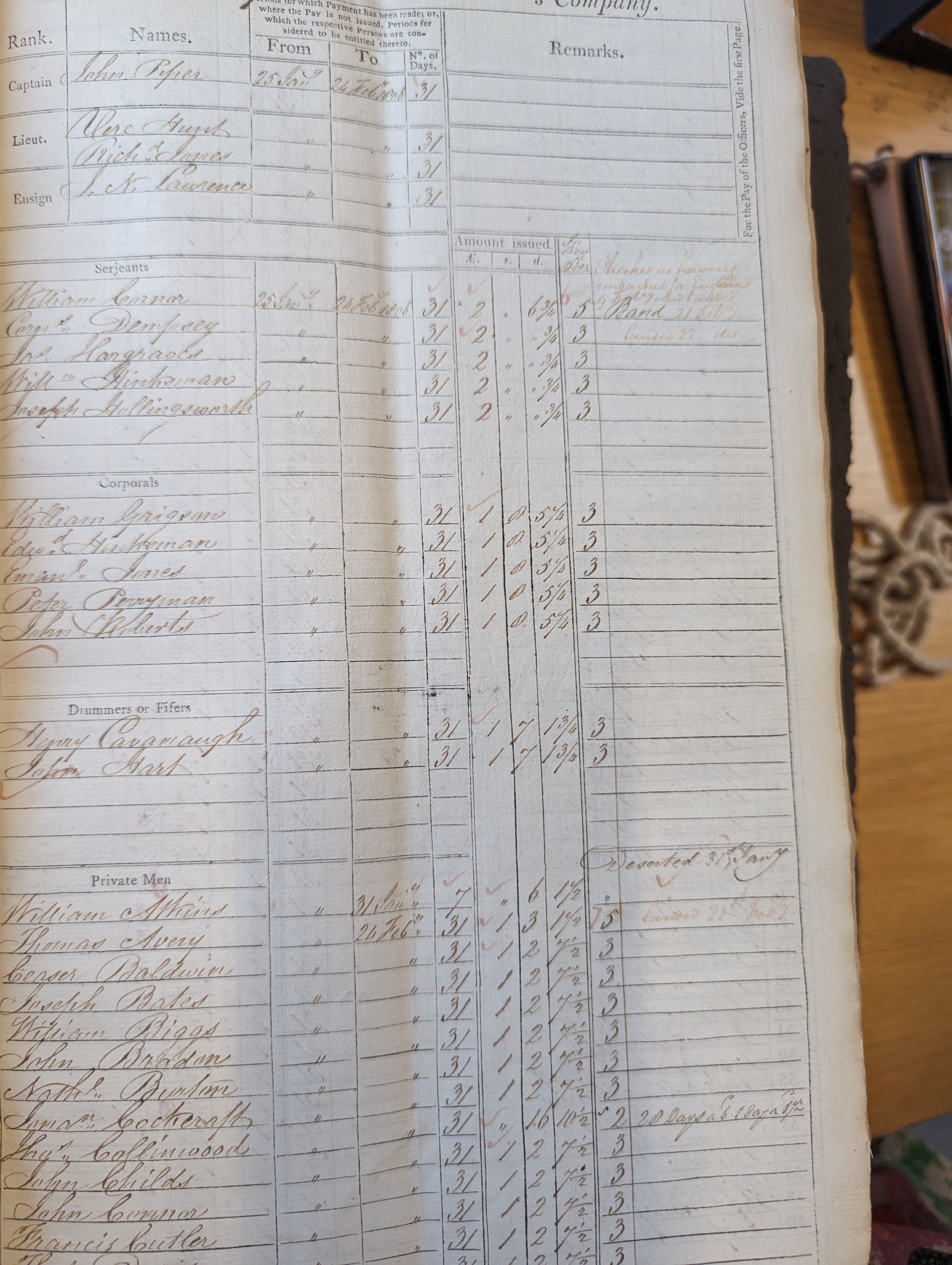 25 Jan 1806 to 24 Feb 1806, Captain Piper's Company, Serjeants, Willm Hinksman