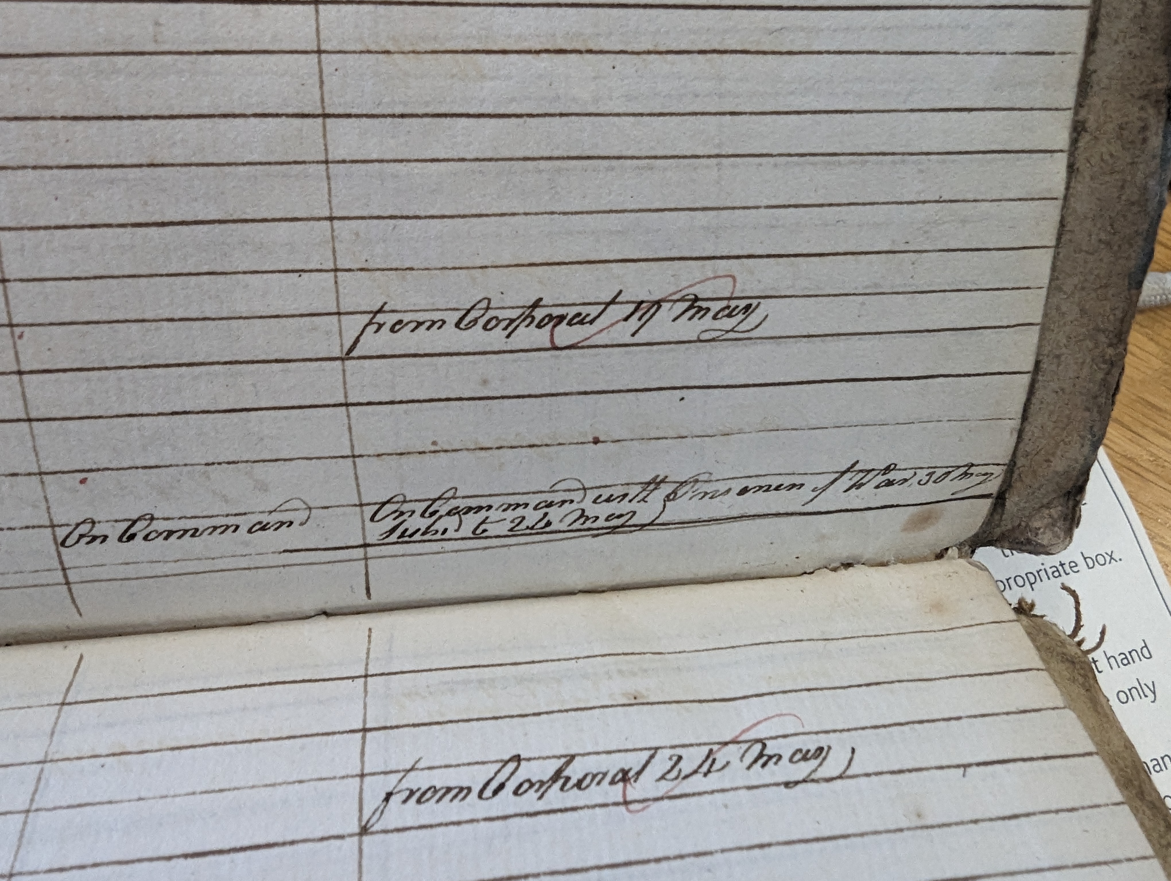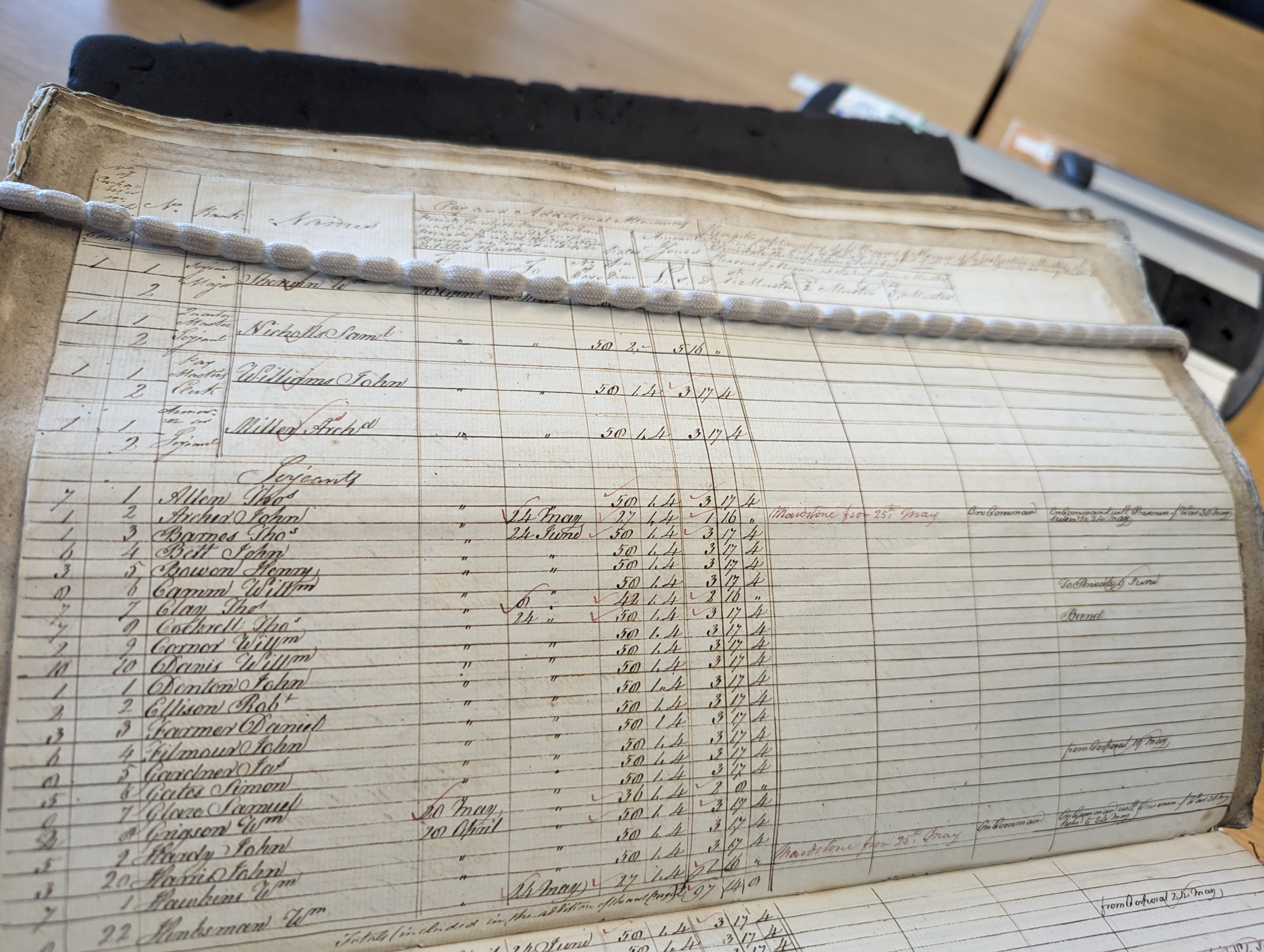 William Hinksman, sergeant in Captain Wilson’s company, paid from 28 [or 24?] Apr to 24 May, 27 days. Remarks in red: Maidstone from 25th May. 3rd Muster: "On Command". Remarks: "On Command with Prisoners of War 30 May. Subs to 25 May"