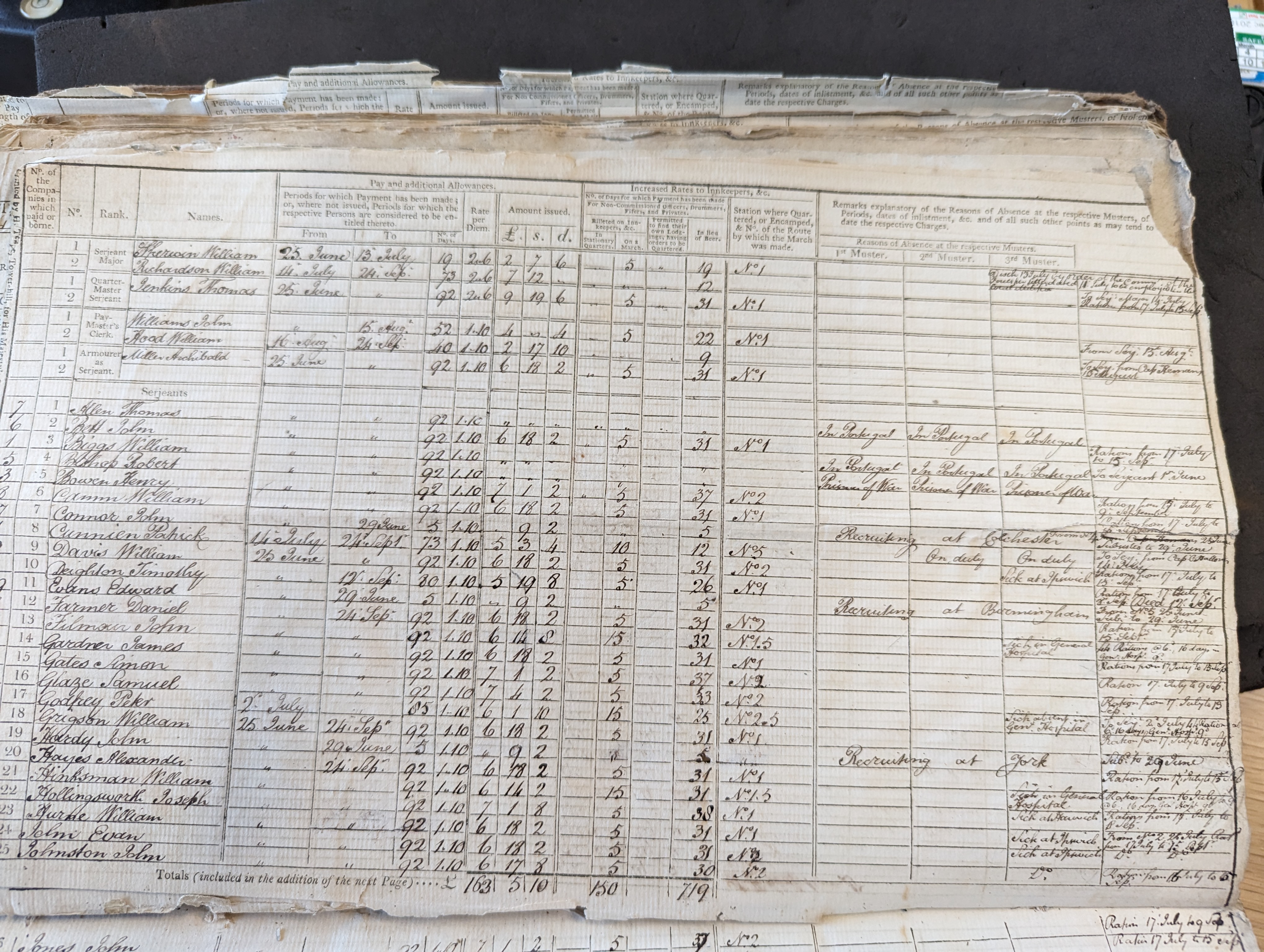 William Hinksman, sergeant, paid 25 Jun to 24 Sep, billeted 15 days on a march, 31 days paid in lieu of beer. He marched routes 1 and 5. Missed third muster due to “Sick in general hospital” (there were several other sergeants who were sick). Remarks: “Ration from 16 July to [—–], @6, 16 days general hospital 9”