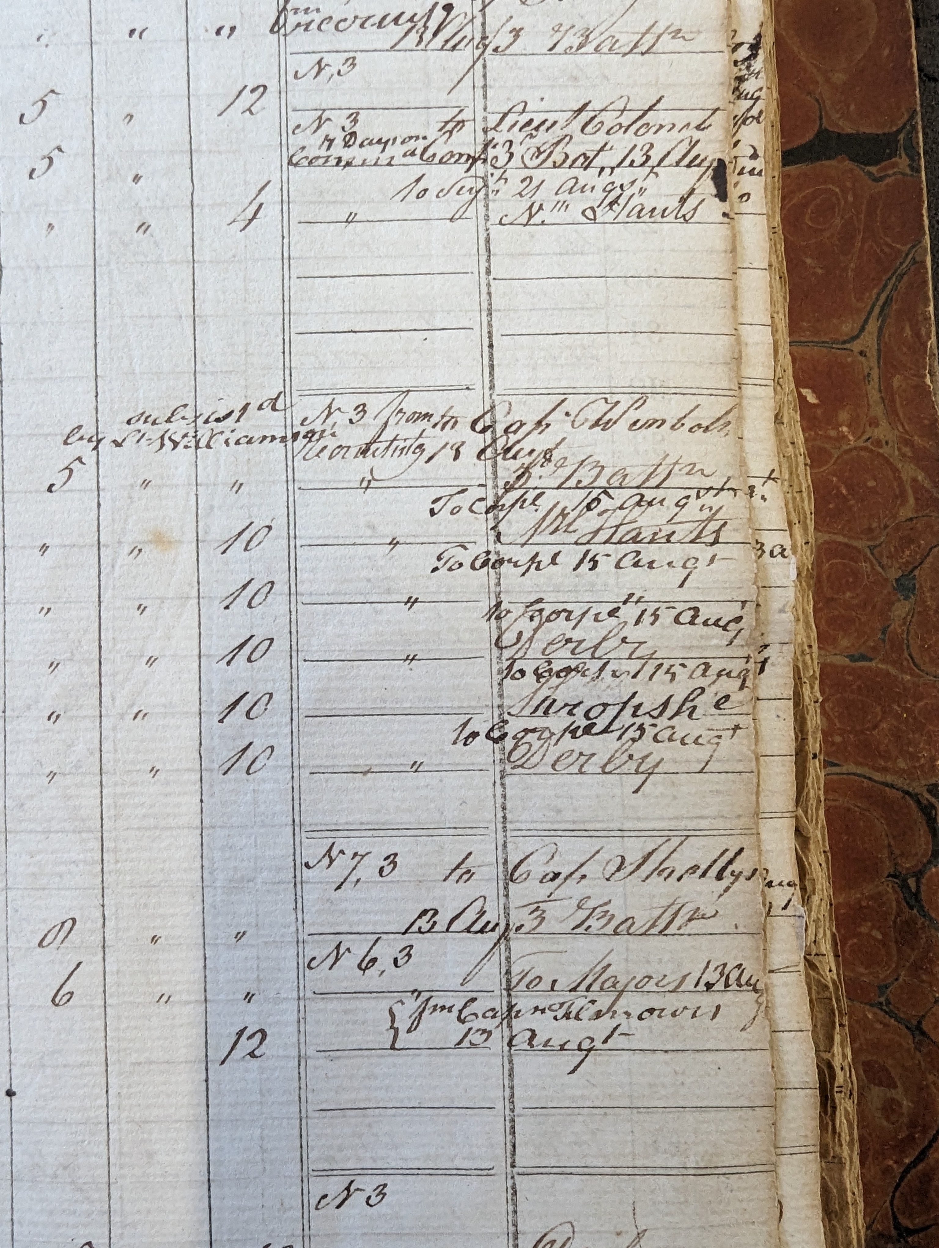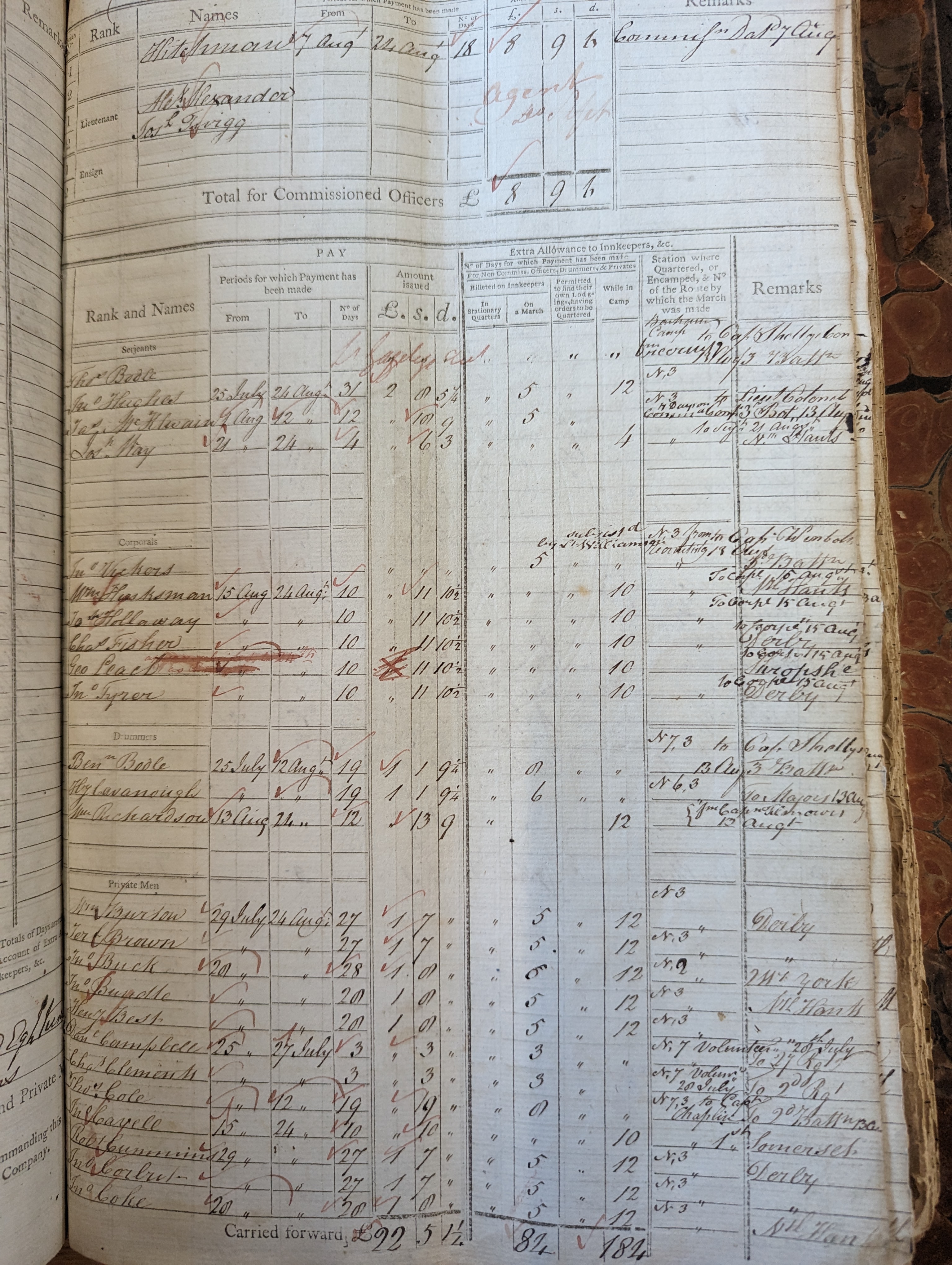 Wm Hinksman, corporal, Captain Hitchman’s company. Stationed at Barham camp. Remarks: “To corpl 15 Aug. Sth Hants”. He was paid from 15th August to 24th August.