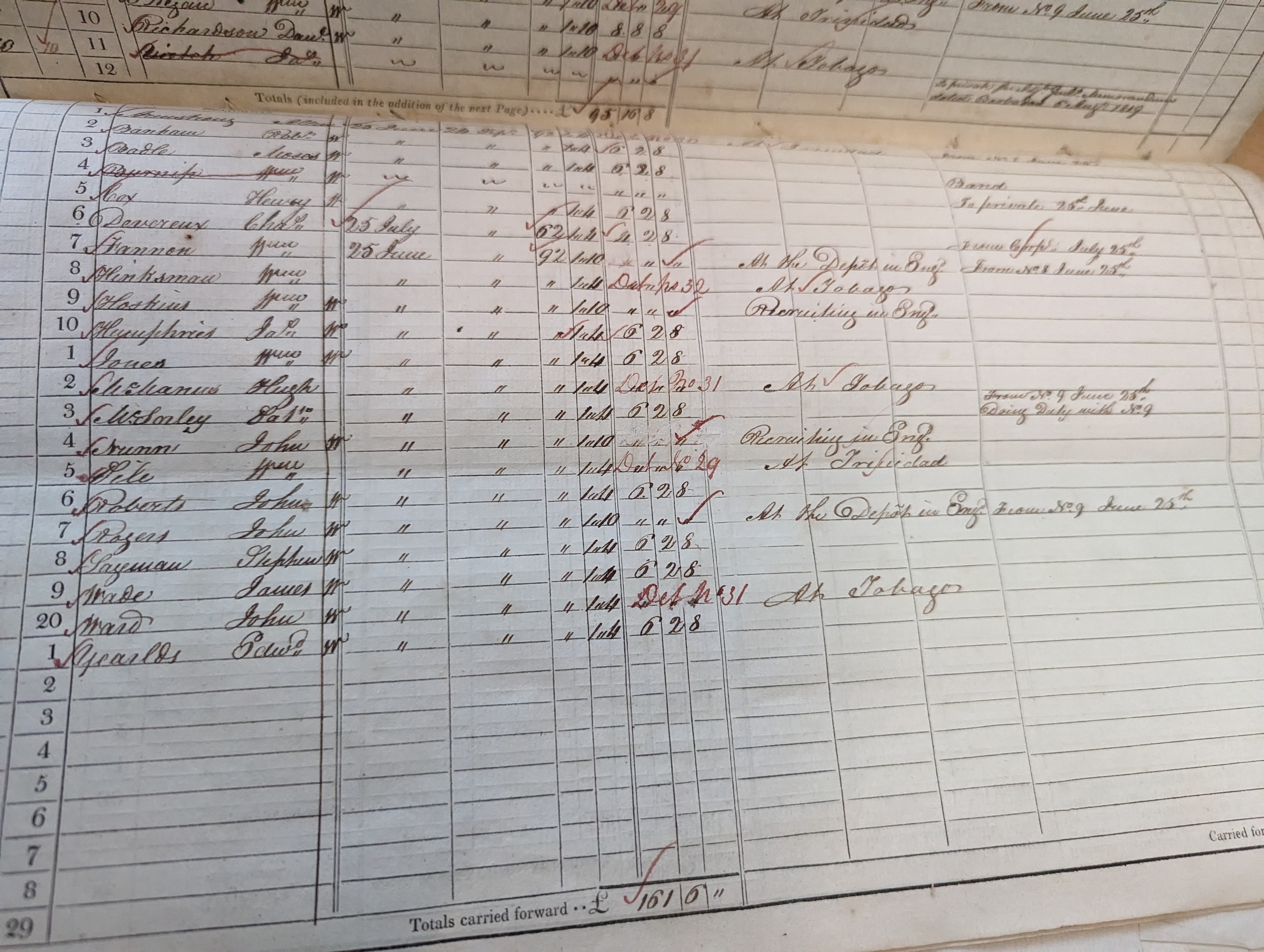 Wm Hinksman, sergeant. Absent from all three musters with comment: “at Tobago”. In red is written “Det no 32”.