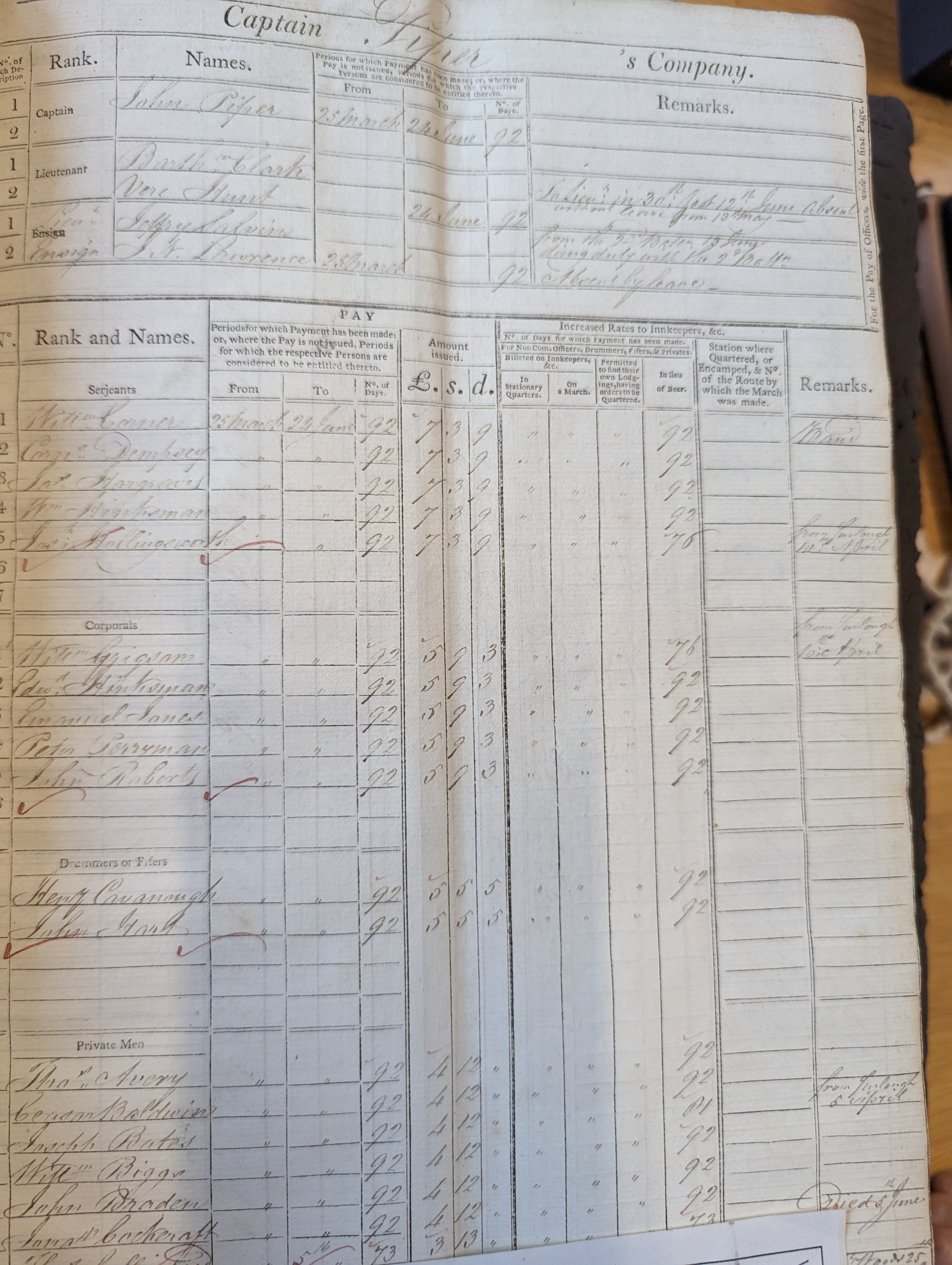 William Hinksman, sergeant in Captain Piper’s company, paid 25 Mar to 24 Jun, 92 days.No remarks.