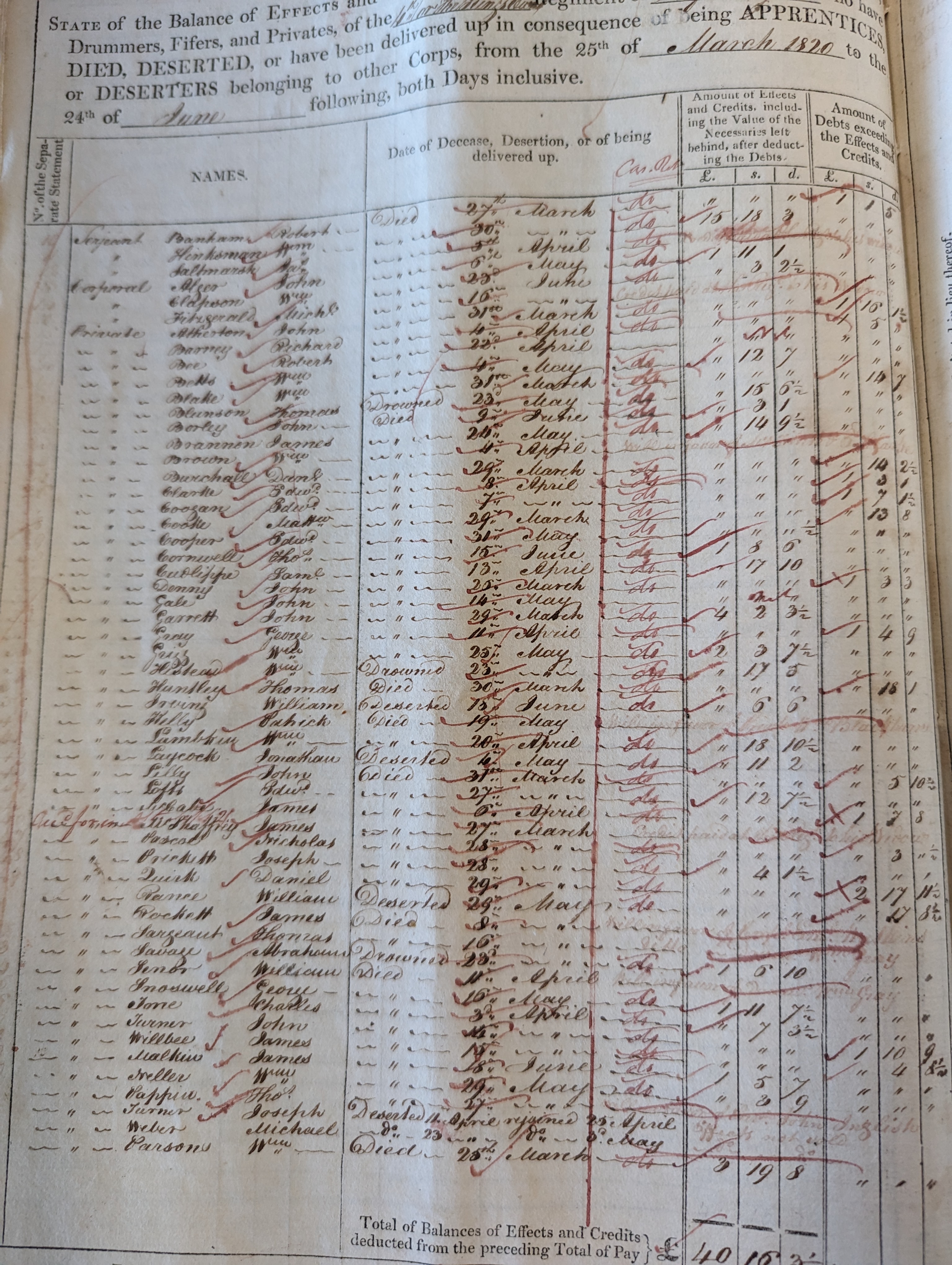 Cited from General Muster Books and Pay Lists, WO 12/2209, 4th Foot 1st Battalion, 1820-1822 (Commissary General of Musters Office and successors)