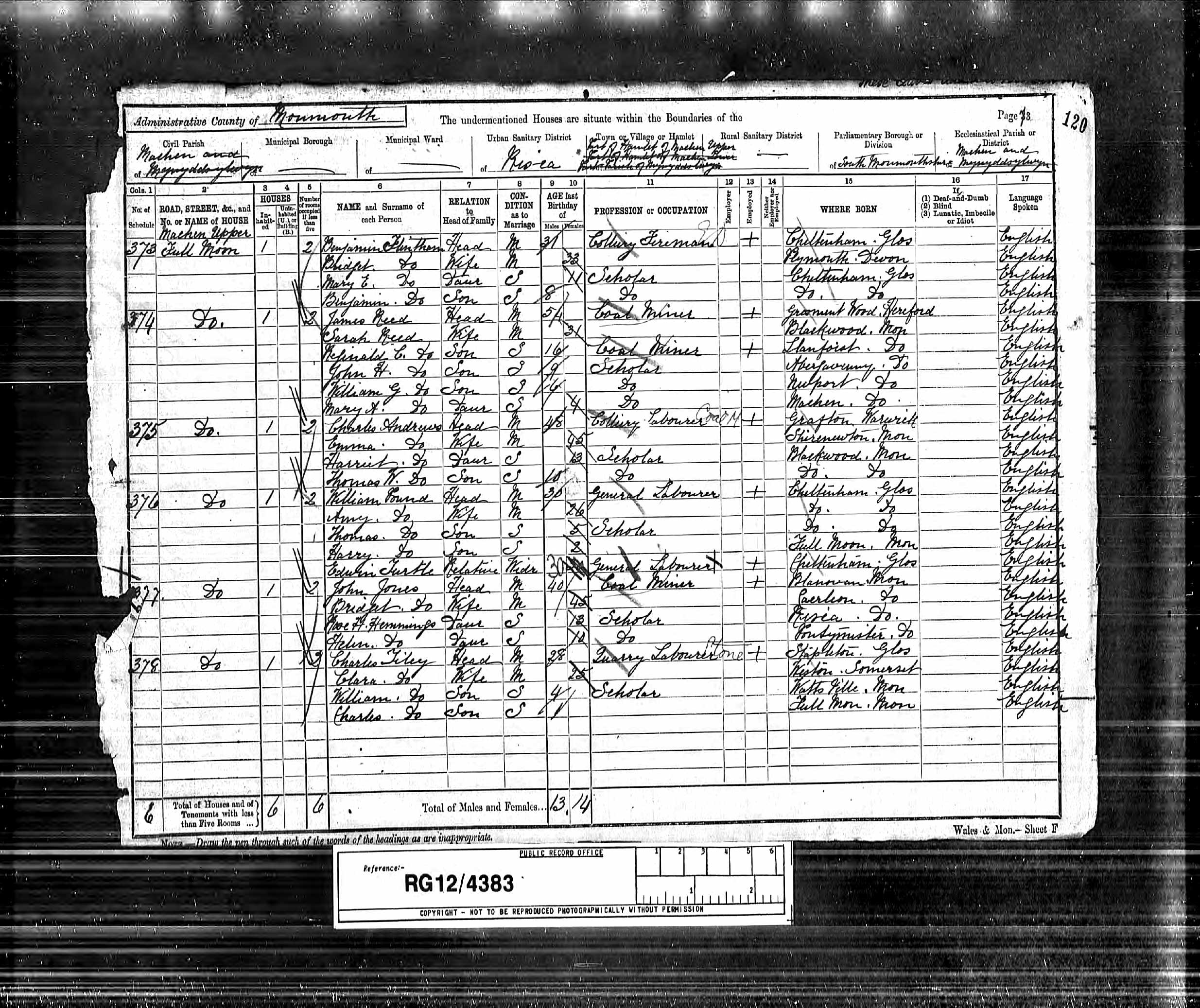 - was recorded in the census on 5 Apr, 1891 in Full Moon, Newtown, Mynyddyslwyn, Monmouthshire, Wales