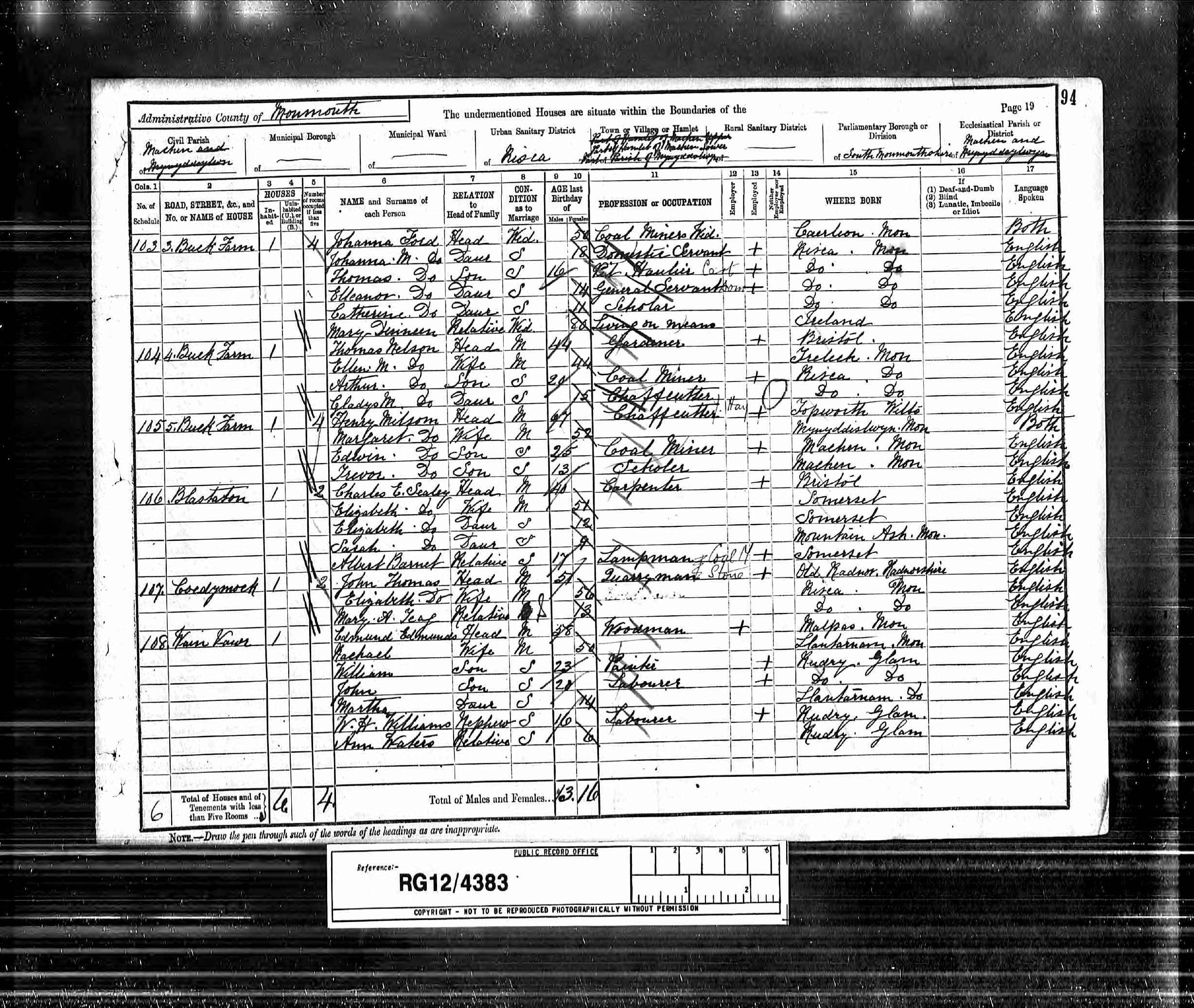 Class RG12, Piece 4383, Folio 94, Page 19, Schedule 103