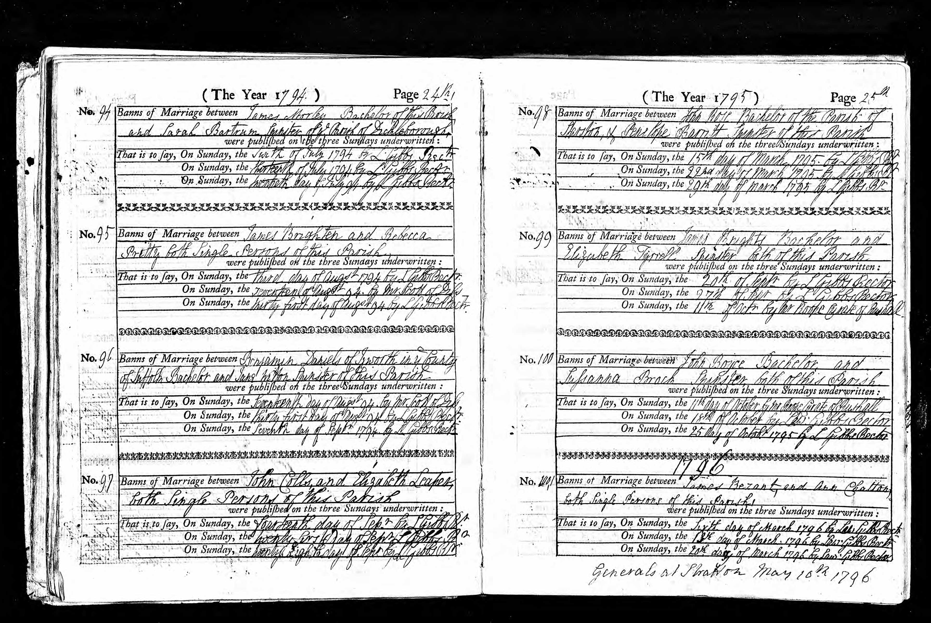 Banns of Marriage for James Brighten and Rebecca Pritty, 3 Aug 1794, Page 24, No 95