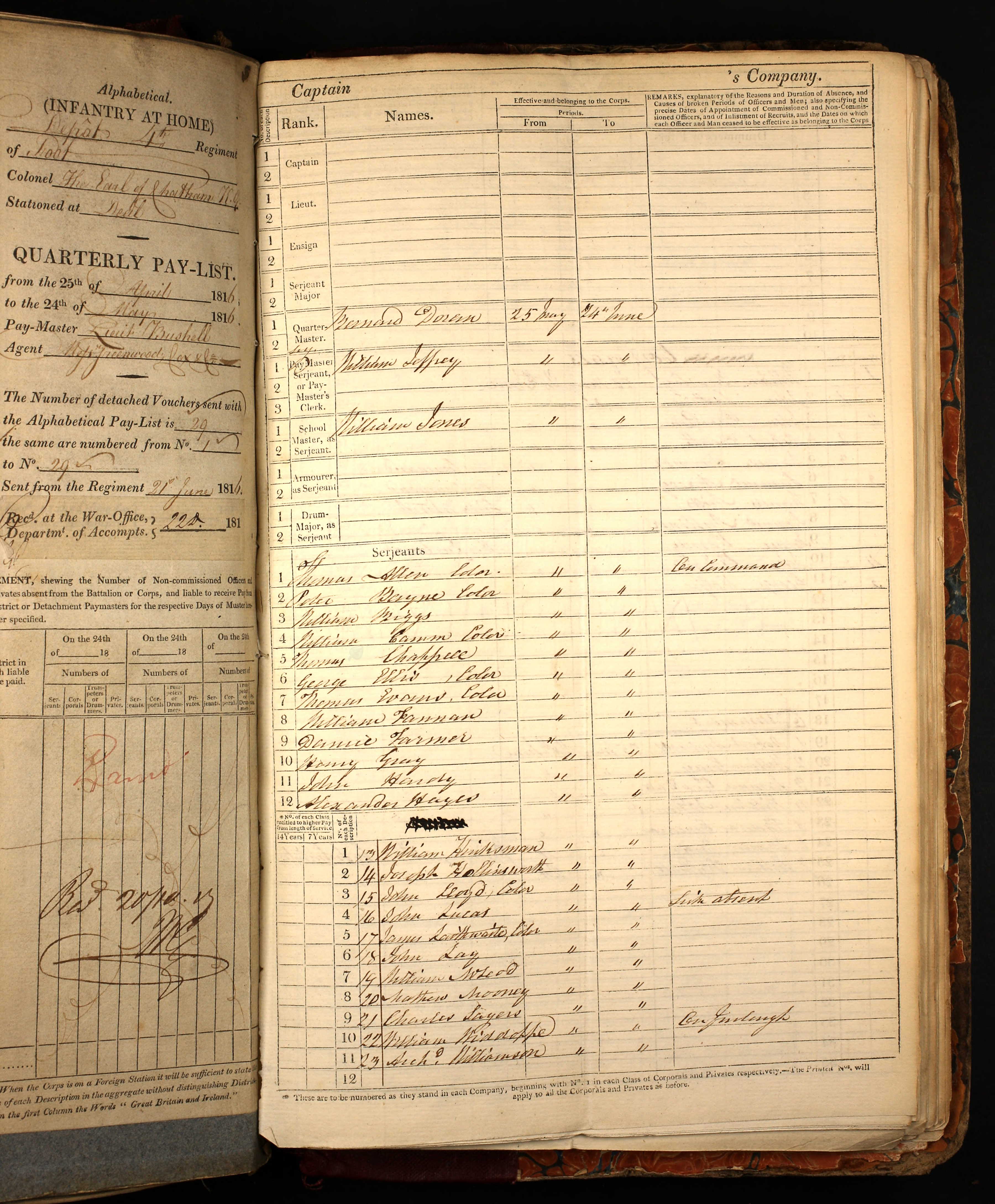 Cited from General Muster Books and Pay Lists, WO 12/2207, 4th Foot 1st Battalion, 1815-1816 (Commissary General of Musters Office and successors)