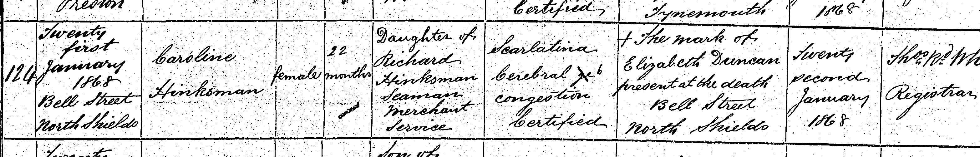 Death in the Registration District of Tynemouth, Northumberland, 1868, no. 124. Died 21 Jan 1868 at Bell Street, North Shields; Caroline Hinksman; Female; age 22 months; Daughter of Richard Hinksman, Seaman merchant service; cause of death was Scarlatina; Cerebral Congestion; certified. Informant was Elizabeth Duncan; Bell Street, North Shields; present at death; could not sign name. The death was registered 22 Jan 1868.