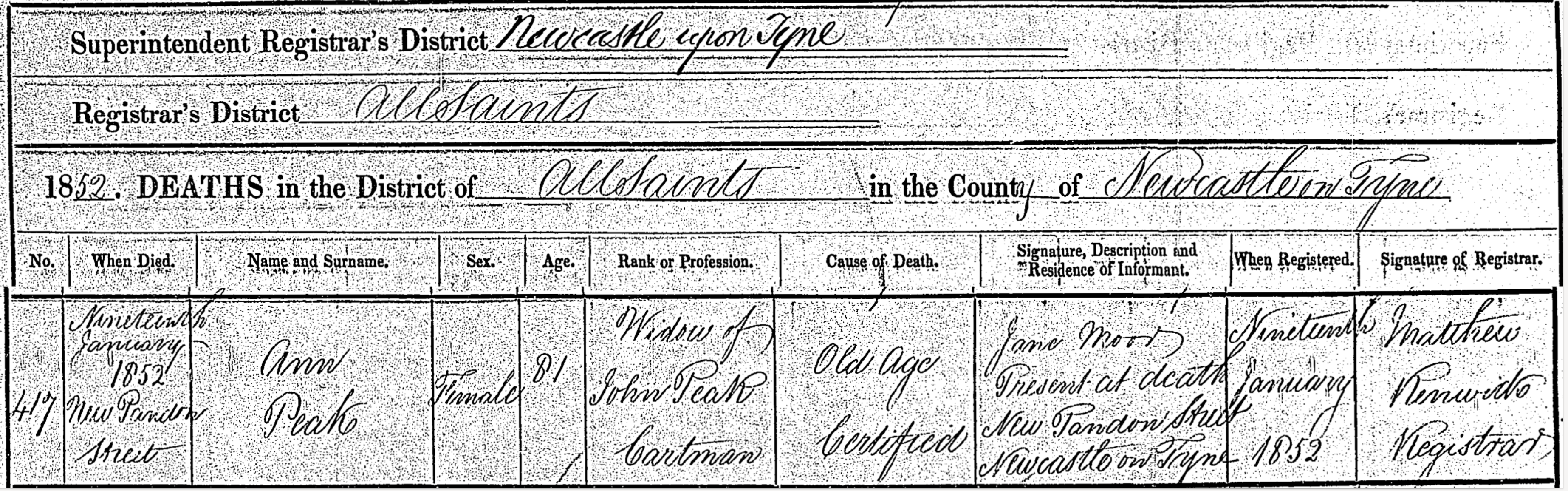 Death in the Registration District of Newcastle Upon Tyne, Sub-district of All Saints, Newcastle on Tyne, 1852, no. 417. Died 19 Jan 1852 at New Pandon Street; Ann Peak; Female; age 81; Widow of John Peak, cartman; cause of death was Old age; certified. Informant was Jane Moor; New Pandon Street, Newcastle on Tyne; present at death; signed name. The death was registered 19 Jan 1852.