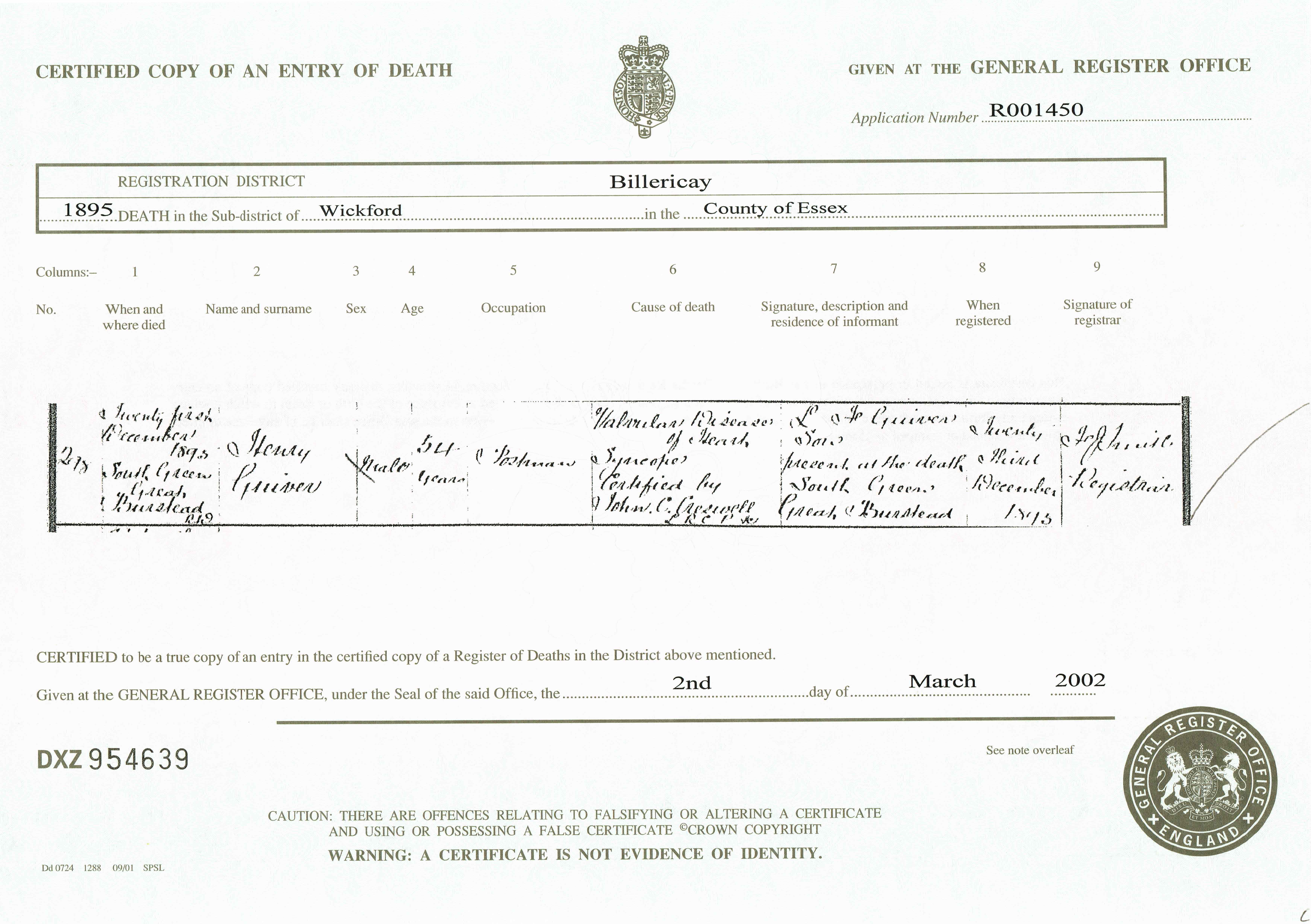Death in the Registration District of Billericay, Sub-district of Wickford, Essex, 1895, no. 218. Died 21 Dec 1895 at South Green, Great Burstead; Henry Guiver; Male; age 54; Postman. Cause of death: Vascular diseases of the heart; syncope; certified. Informant was L [???] Guiver (signed name); relation: Son; residing at South Green, Great Burstead; present at death. The death was registered 23 Dec 1895.