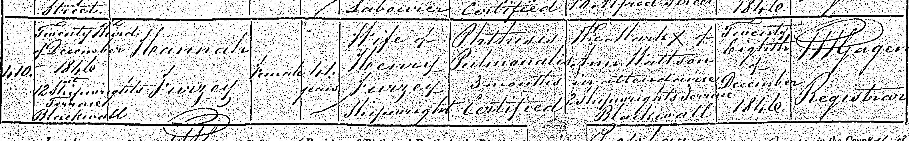 Death in the Registration District of Poplar, Middlesex, 1846, no. 410. Died 23 Dec 1846 at 12 Shipwrights Terrace, Blackwell; Hannah Furzey; Female; age 41; Wife of Henry Furzey, Shipwright. Cause of death: Phthisis; Pulmonalis Bronchitis; certified. Informant was Ann Wattson (could not sign name); relation: Not known; residing at 2 Shipwrights Terrace, Blackwall; present at death. The death was registered 28 Dec 1846.