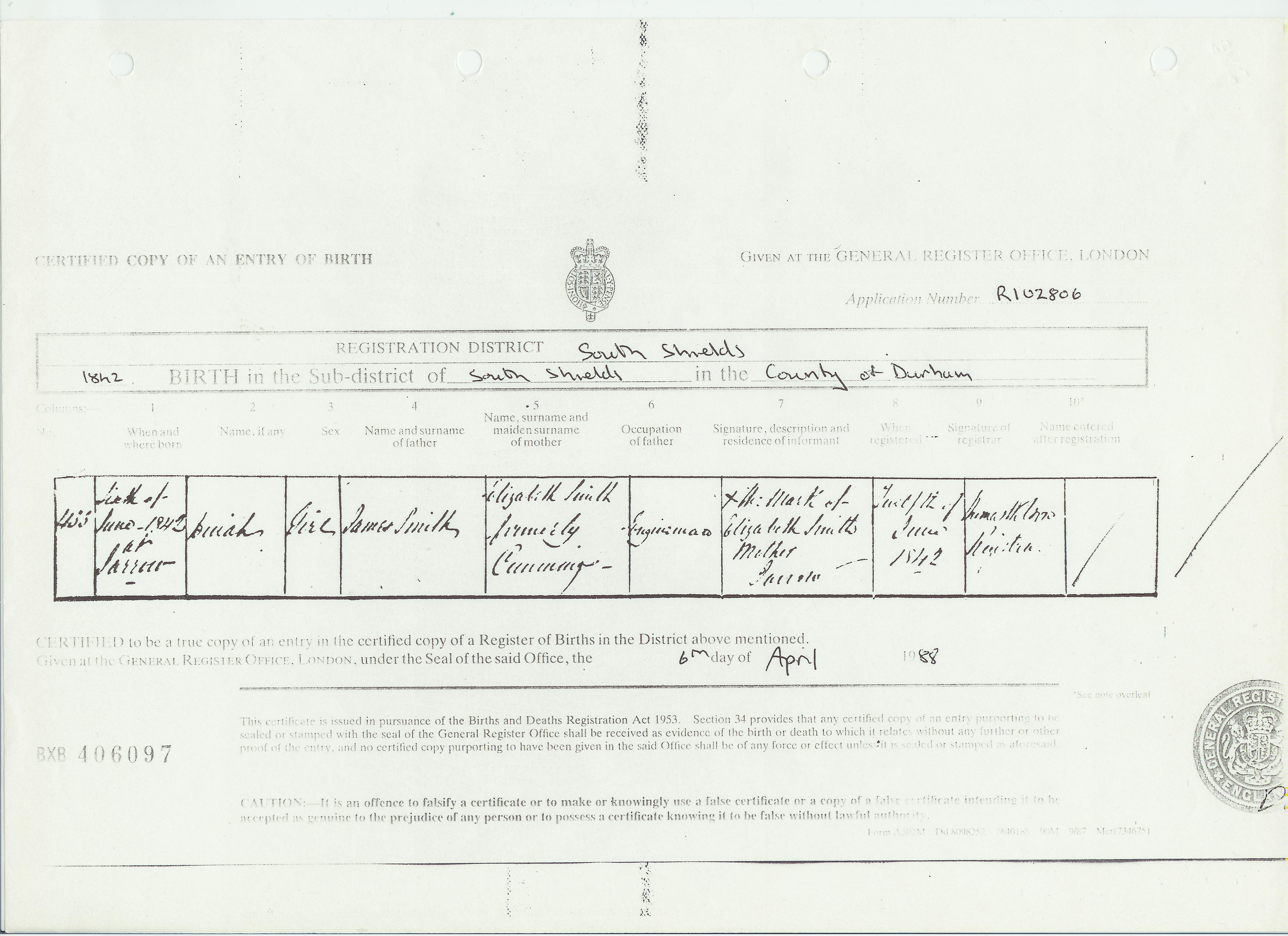 Birth in the Registration District of South Shields, Sub-district of South Shields, Durham, 1842, no. 433. Born 6 Jun 1842 at Jarrow; Dinah Smith; Girl; father James Smith; mother Elizabeth Smith formerly Cummings. Occupation of father: Engineman. Informant was Elizabeth Smith; Mother; Jarrow; could not sign name. The birth was registered 12 Jun 1842.