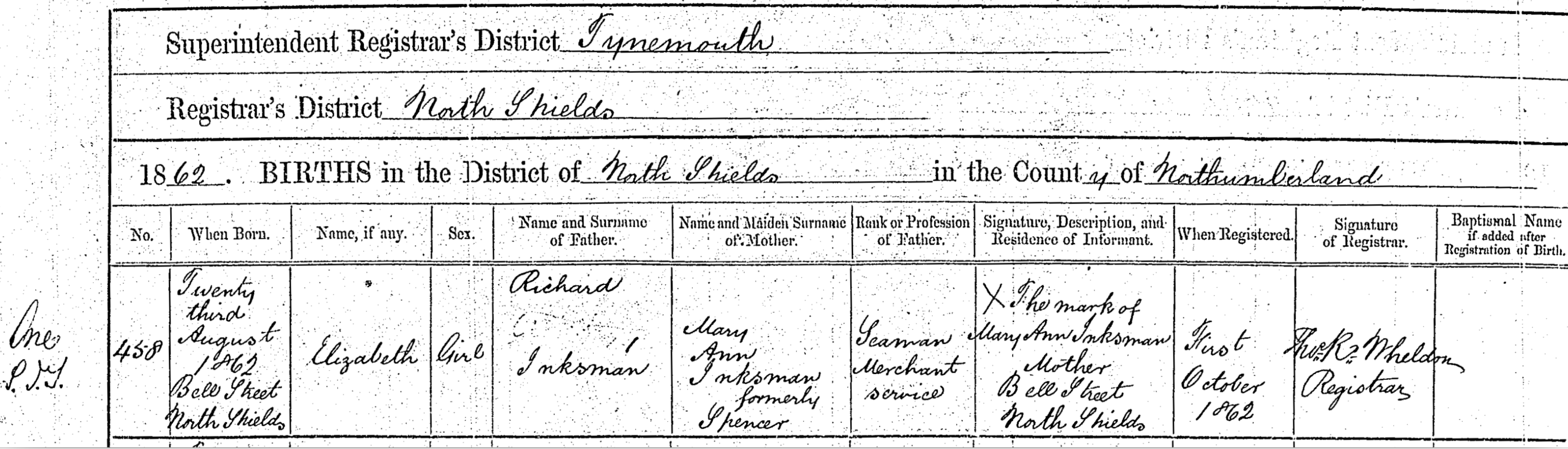 Birth in the Registration District of Tynemouth, Sub-district of North Shields, Northumberland, 1862, no. 458. Born 23 Aug 1862 at Bell Street, North Shields; Elizabeth Inksman; Girl; father Richard Inksman; mother Mary Ann Inksman formerly Spencer. Occupation of father: Seaman, Merchant Service. Informant was Mary Ann Inksman; Mother; Bell Street, North Shields; could not sign name. The birth was registered 1 Oct 1862.