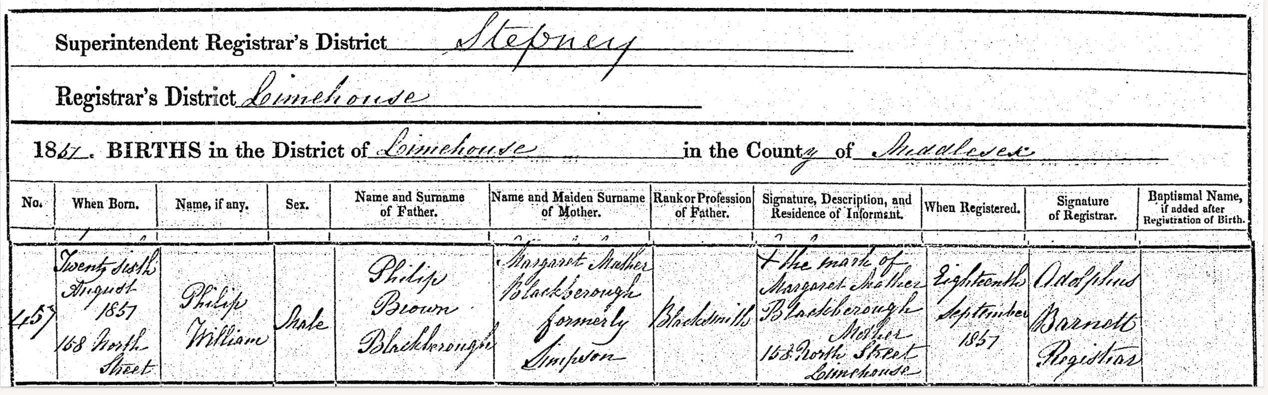 Birth in the Registration District of Stepney, Sub-district of Limehouse, Middlesex, 1851, no. 457. Born 26 Aug 1851 at 158 North Street; Philip William Blackborough; Boy; father Philip Brown Blackborough; mother Margaret Mather Blackborough formerly Simpson. Occupation of father: Blacksmith. Informant was Margaret Mather Blackborough; Mother; 158 North Street, Limehouse; could not sign name. The birth was registered 18 Sep 1851. Certificate year looks like 1857 but GRO entry is 1851; SEP; STEPNEY; vol 2; page 513