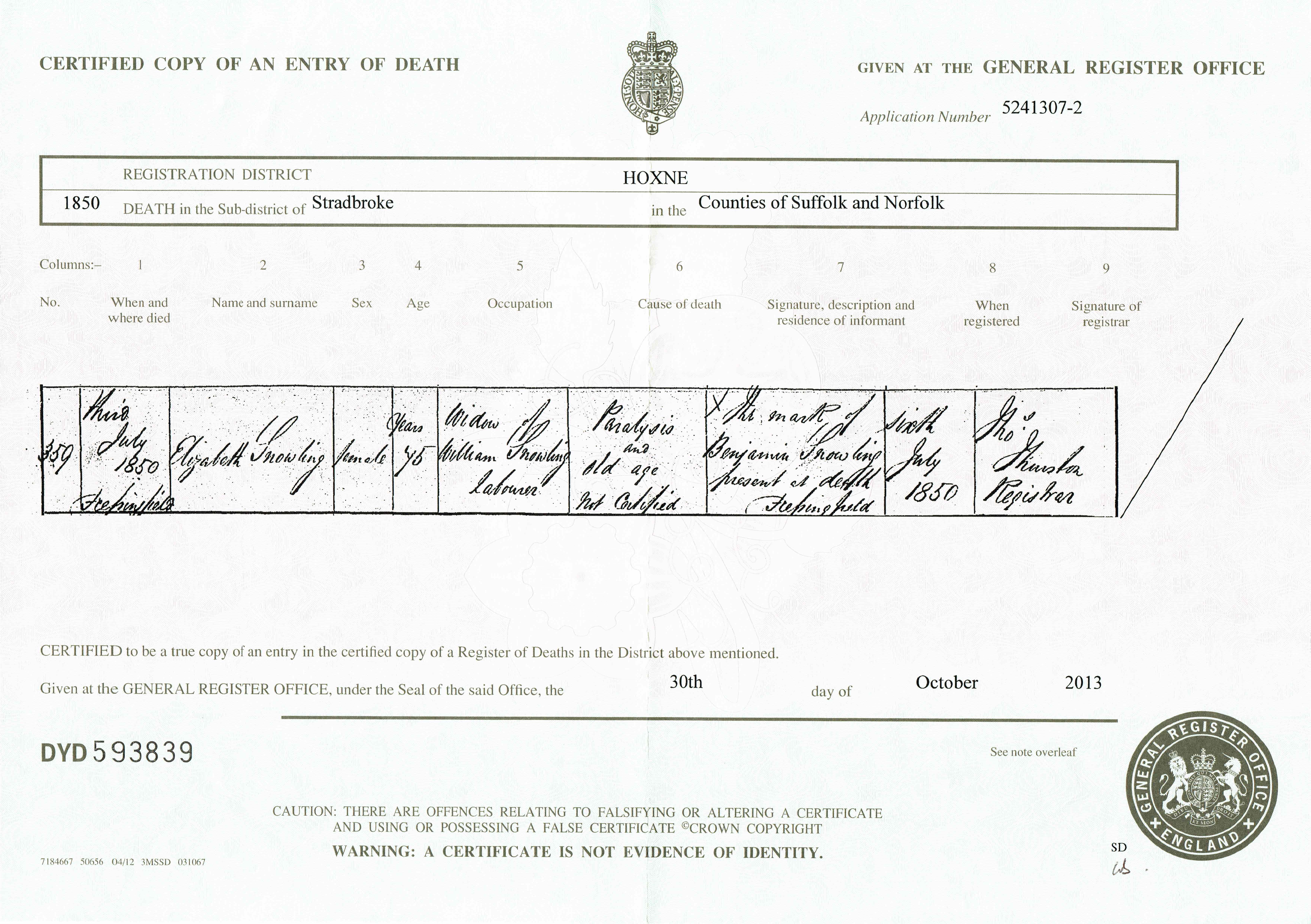 Death in the Registration District of Hoxne, Sub-district of Stradbroke, Suffolk and Norfolk, 1850, no. 359. Died 3 Jul 1850 at Fressingfield; Elizabeth Snowling; Female; age 75; Widow of William Snowling, labourer; cause of death was Paralysis and old age not certified. Informant was Benjamin Snowling; Fressingfield; present at death; could not sign name. The death was registered 6 Jul 1850.