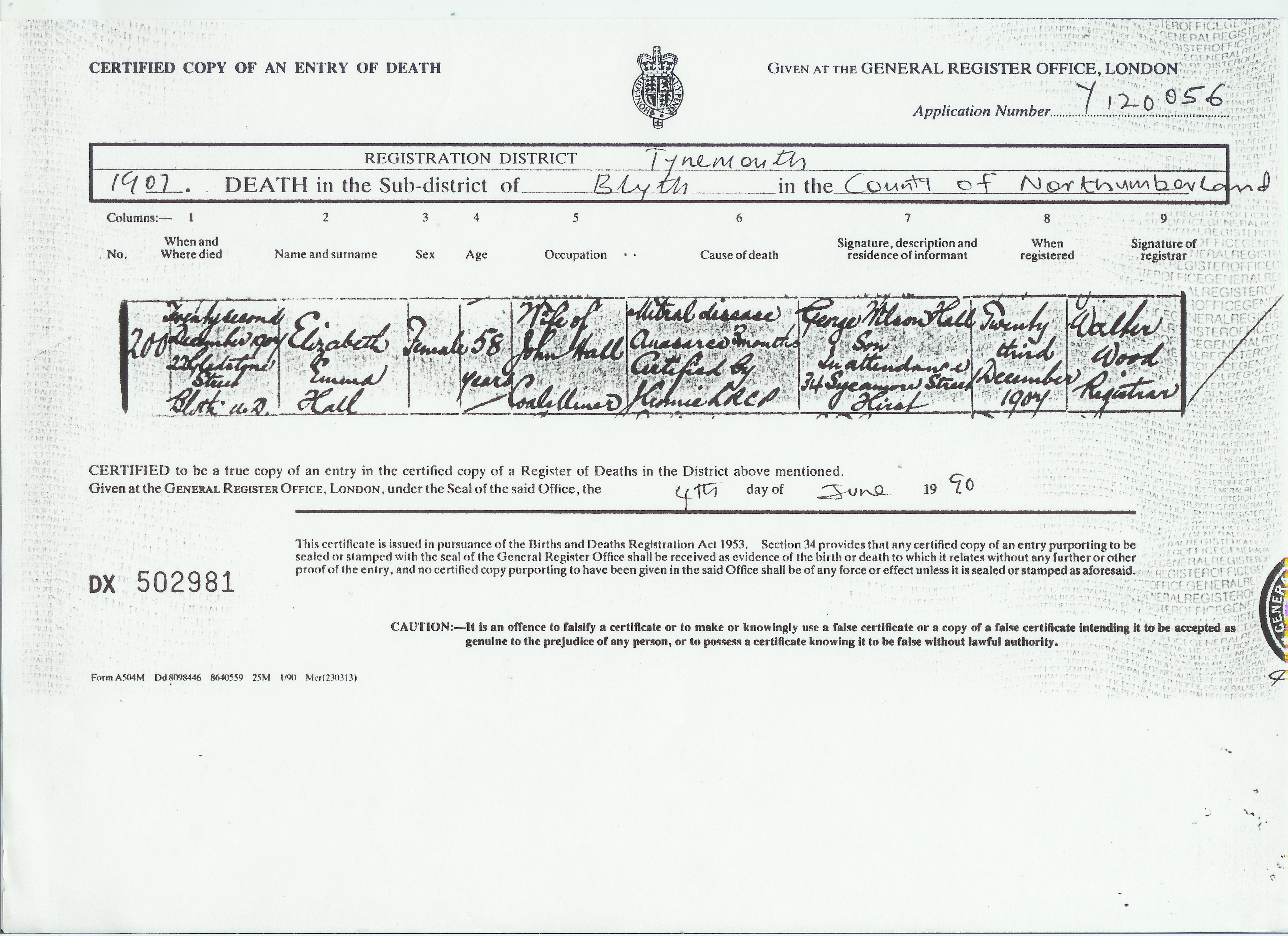 Death in the Registration District of Tynemouth, Sub-district of Blyth, Northumberland, 1907, no. 200. Died 22 Dec 1907 at 22 Gladstone Street, Blyth; Elizabeth Emma Hall; Female; age 58; wife of John Hall, Coal miner; cause of death was Mitral disease, anasarca 3 months; certified. Informant was George Wilson Hall; 34 Sycamore Street, Hirst; present at death; signed name. The death was registered 23 Dec 1907.