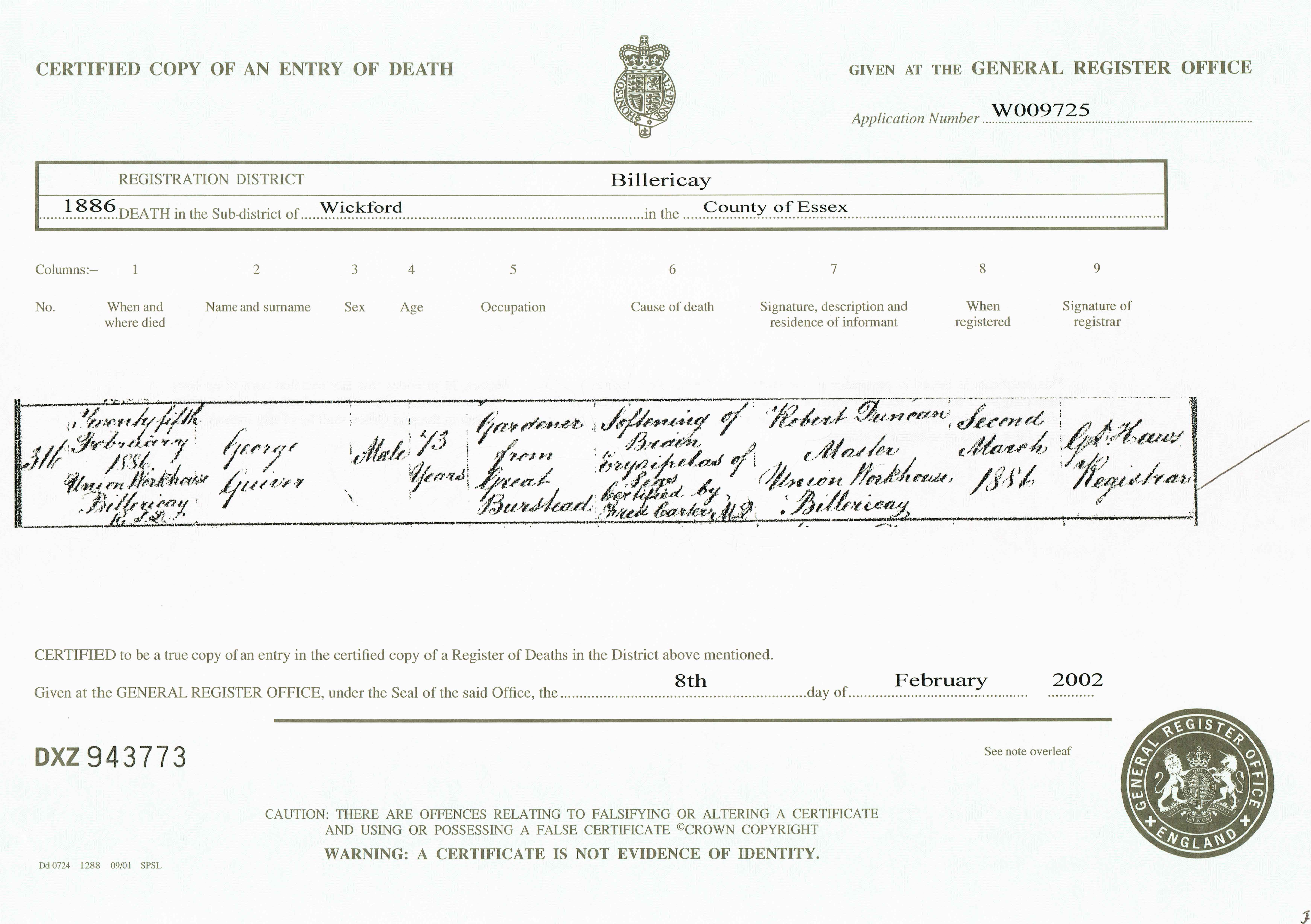 Death entry for George Guiver, Billericay, Jan-Mar Qtr 1886, Vol 4A, Page 235, No 316; Certified copy obtained 8 Feb 2002