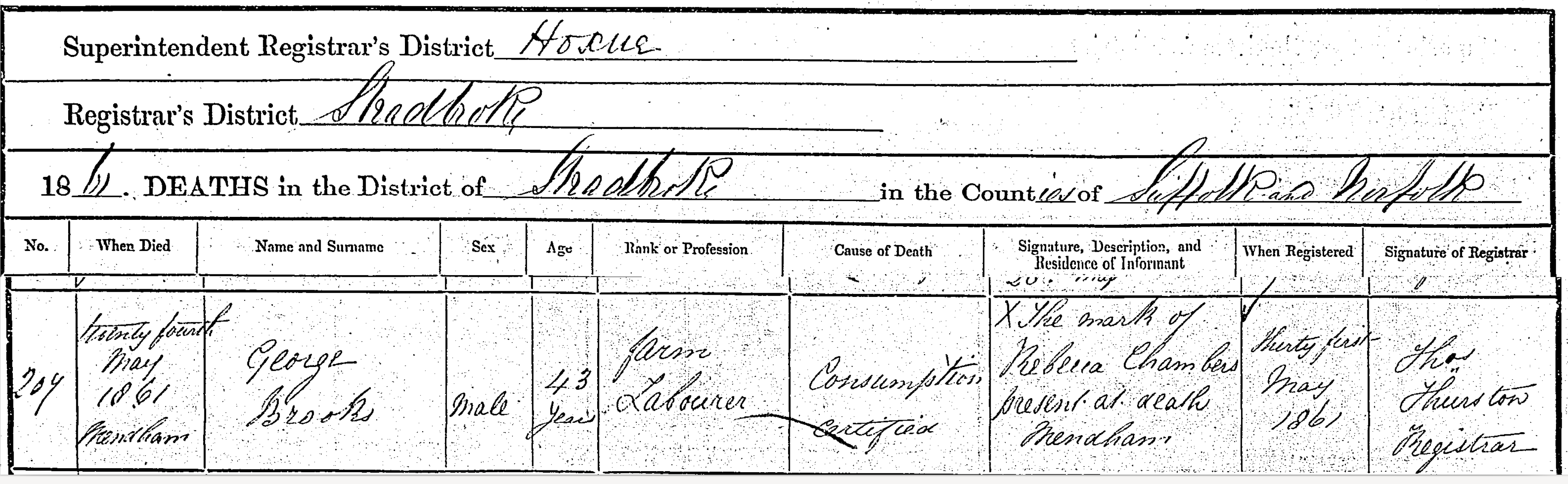 Death in the Registration District of Hoxne, Sub-district of Stradbroke, Suffolk and Norfolk, 1861, no. 207. Died 24 May 1861 at Mendham; George Brooks; Male; age 43; Farm labourer. Cause of death: Consumption; certified. Informant was Rebecca Chambers (could not sign name); relation: Not known; residing at Mendham; present at death. The death was registered 21 May 1861.