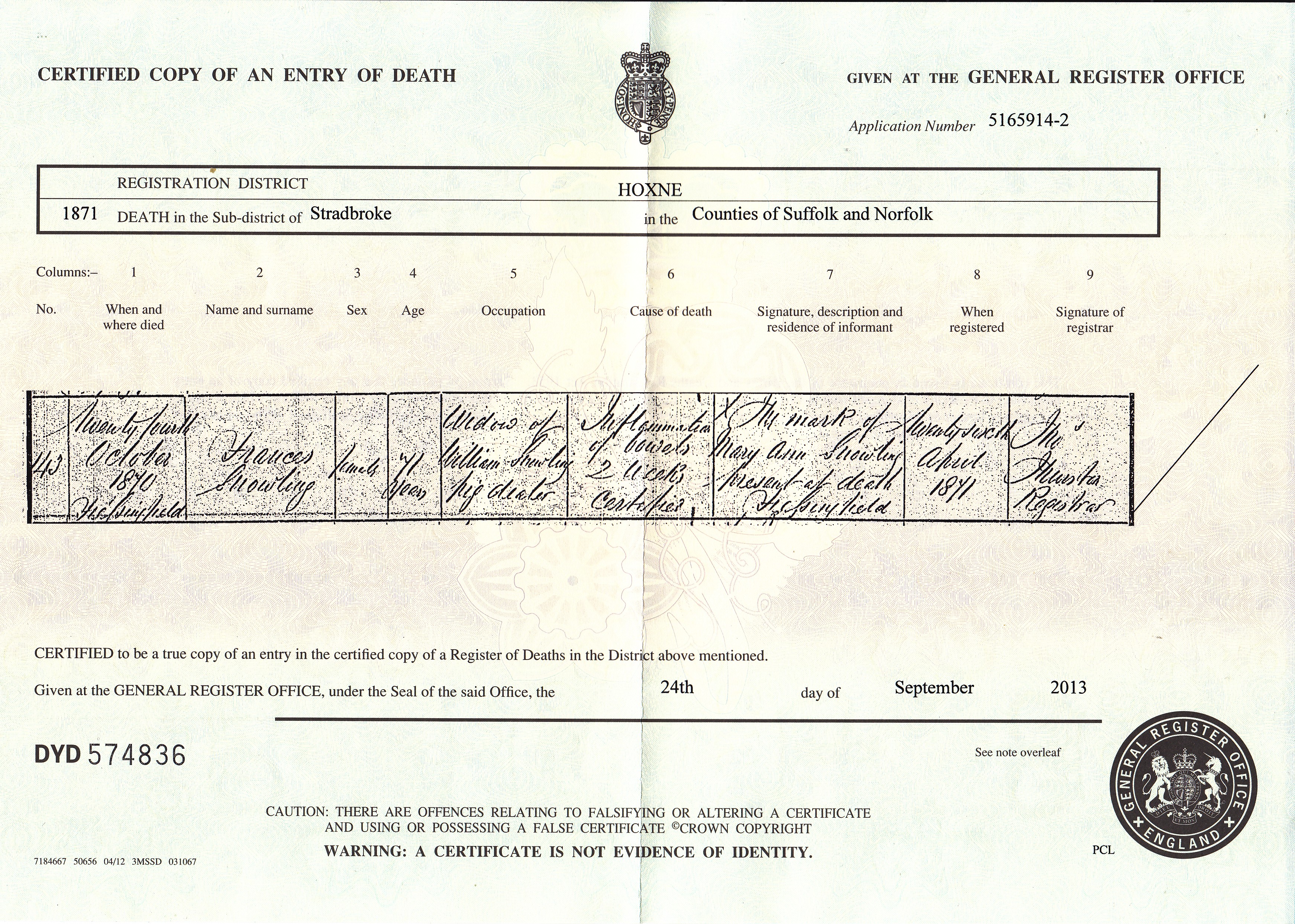 General Register Office of England and Wales; Death entry for Frances Snowling, Hoxne, Apr-Jun Qtr 1871, Vol 04A, Page 369, No 143; Certified copy obtained 24 Sep 2013.
