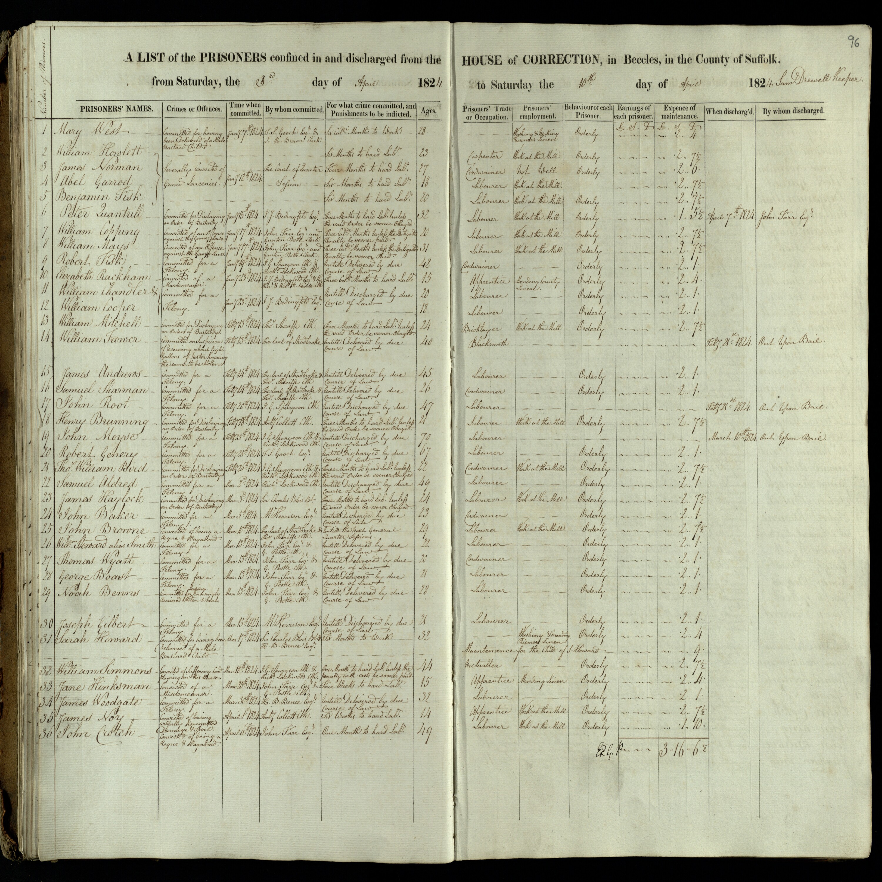 Beccles House of Correction: Lists of Prisoners (1791-1848); 3 Apr 1824 to 10 Apr 1824, Reference A1122/8/96, No 33, Jane Hinksman.