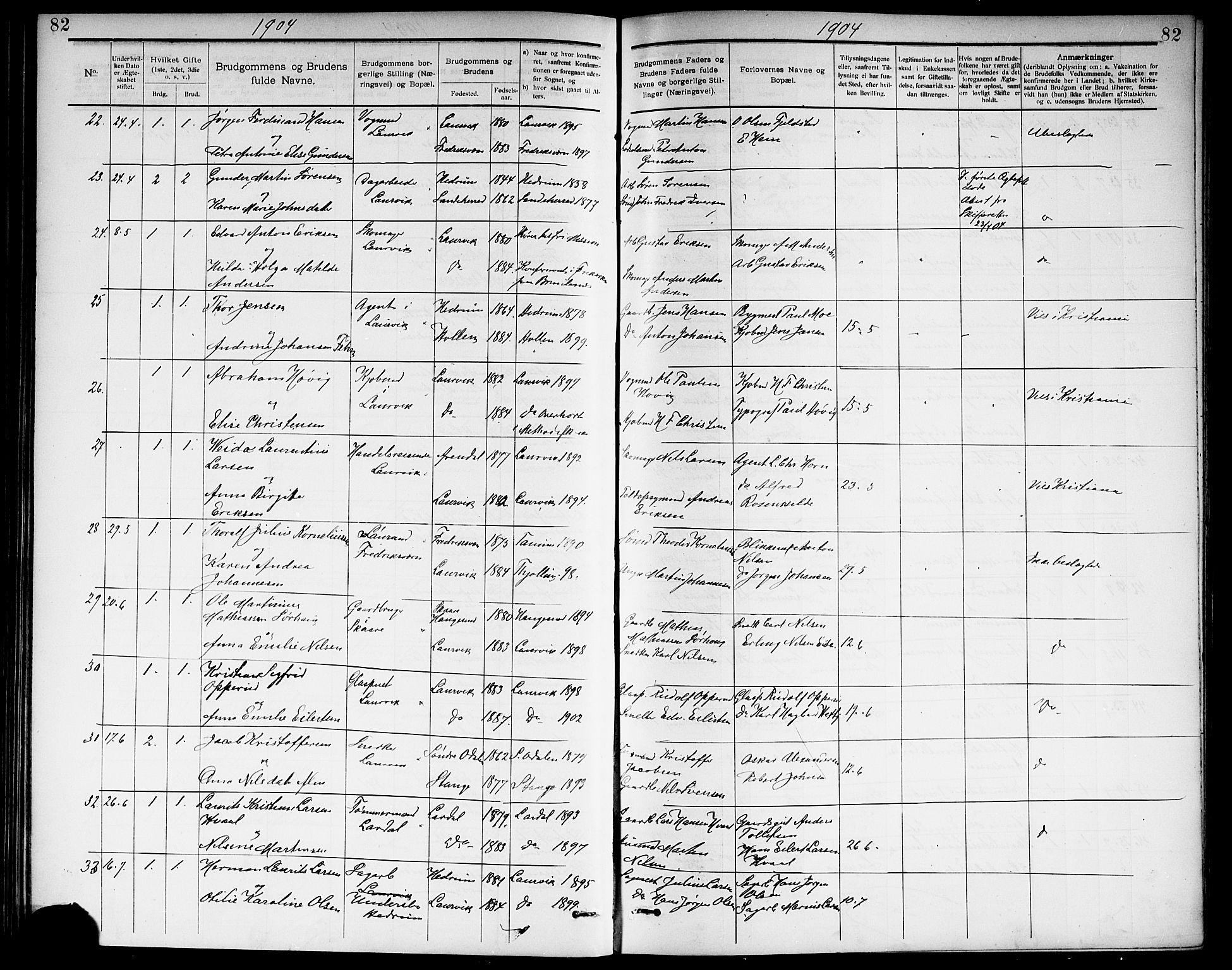 Church Books for Larvik, Vestfold, Norway; Marriage entry for Laurits Kristian Larsen Hvaal and Nilsine Martinddatter, 26 Jun 1904, SAKO/A-352/G/Ga/L0006 (Klokkerbok nr. I 6, 1888-1917), Page 82, No 32.
