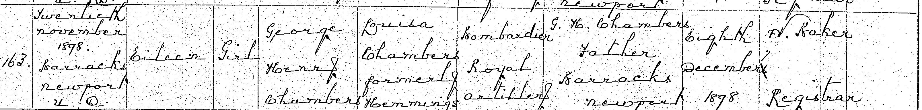 Birth in the Registration District of Newport Mon, Monmouthshire, 1898, no. 163. Born 20 Nov 1898 at Barracks, Newport; Eileen Chambers; Girl; father George Henry Chambers; mother Louisa Chambers formerly Hemmings. Occupation of father: Bombardier Royal Artillery. Informant was G.H. Chambers; Father; Barracks, Newport; signed name. The birth was registered 8 Dec 1898.