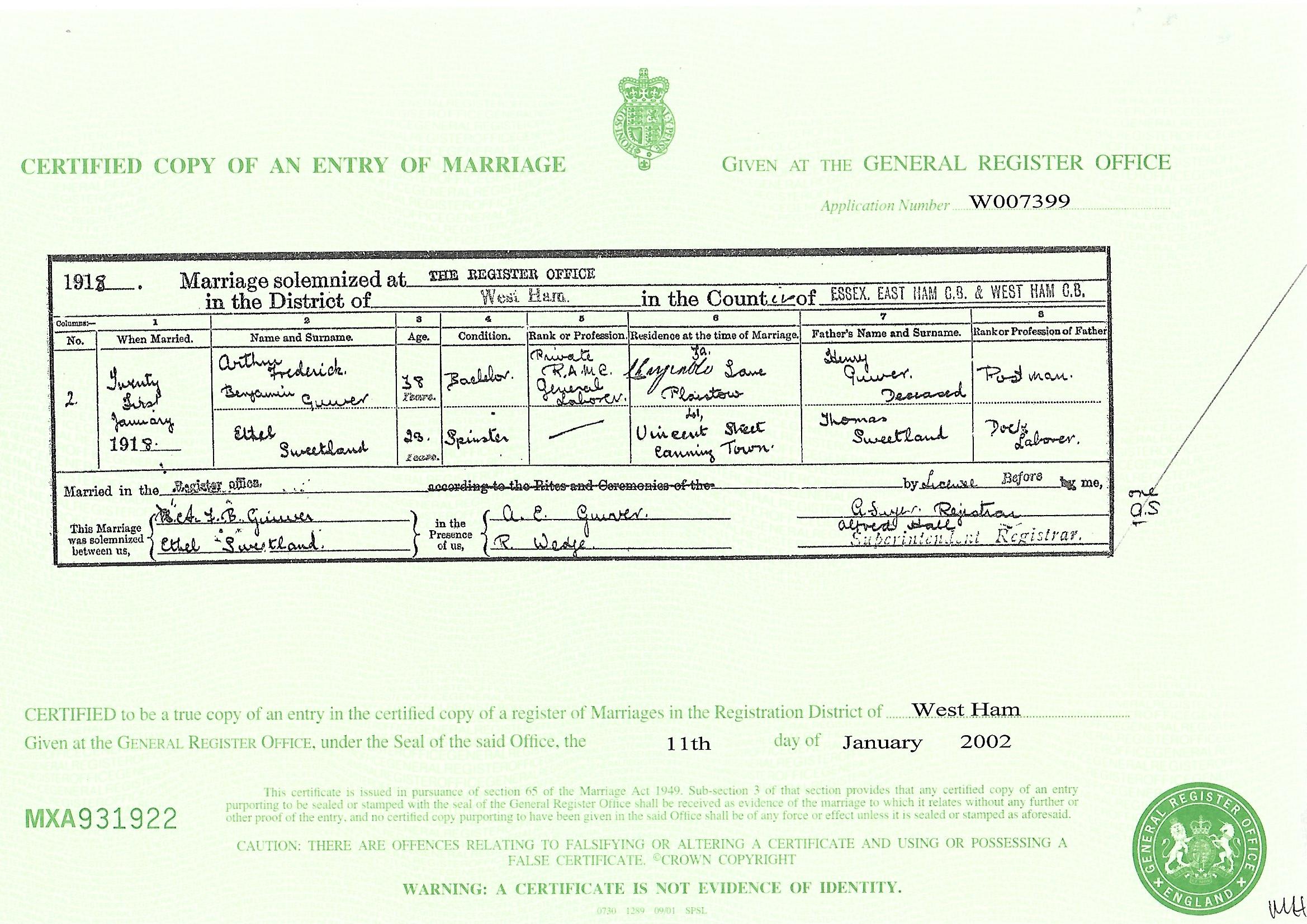 Marriage entry for Arthur F B Guiver and Ethel Sweetland, West Ham, Jan-Mar Qtr 1918, Vol 4a, Page 631, No 2; Certified copy obtained 11 Jan 2002