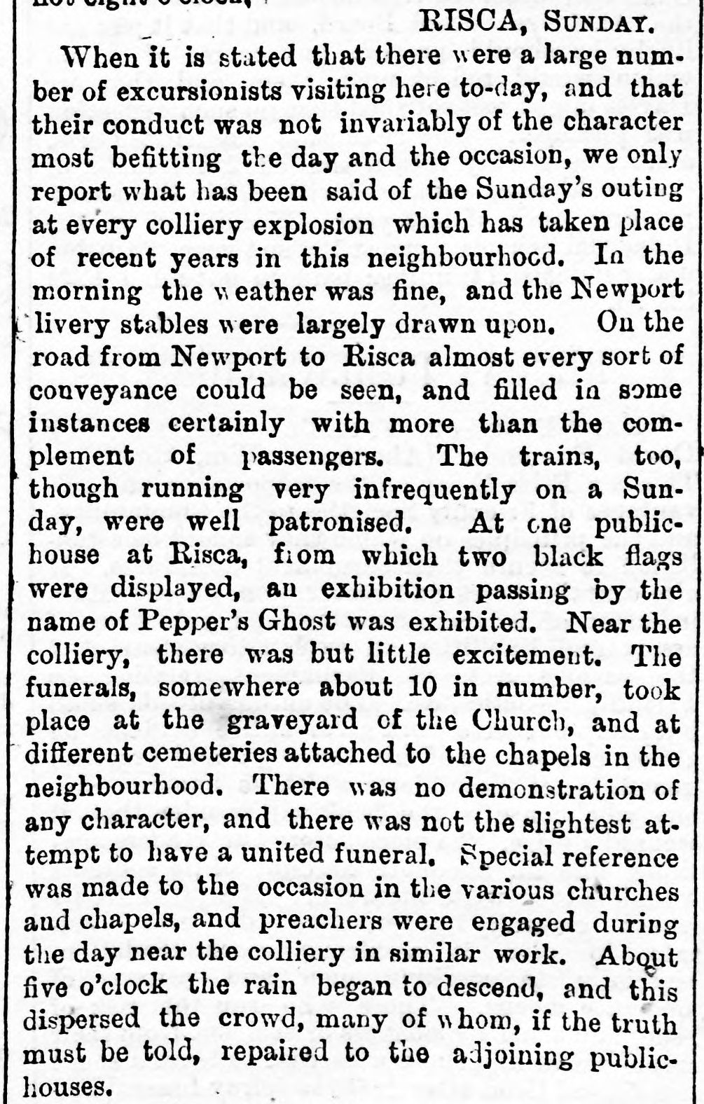 RISCA, SUNDAY.When it is stated that there were a large number of excursionists visiting here today, and that their conduct was not invariably of the character most befitting the day and the occasion, we only report what has been said of the Sunday’s outing at every colliery explosion which has taken place of recent years in this neighbourhood. In the morning the weather was fine, and the Newport livery stables were largely drawn upon. On the road from Newport to Risca almost every sort of conveyance could be seen, and filled in some instances certainly with more than the complement of passengers. The trains, too, though running very infrequently on a Sunday, were well patronised. At one public house at Risca, from which two black flags were displayed, an exhibition passing by the name of Pepper’s Ghost was exhibited. Near the colliery, there was but little excitement. The funerals, somewhere about 10 in number, took place at the graveyard of the Church, and at different cemeteries attached to the chapels in the neighbourhood. There was no demonstration of any character, and there was not the slightest attempt to have a united funeral. Special reference was made to the occasion in the various churches and chapels, and preachers were engaged during the day near the colliery in similar work. About five o’clock the rain began to descend, and this dispersed the crowd, many of whom, if the truth must be told, repaired to the adjoining public-houses.