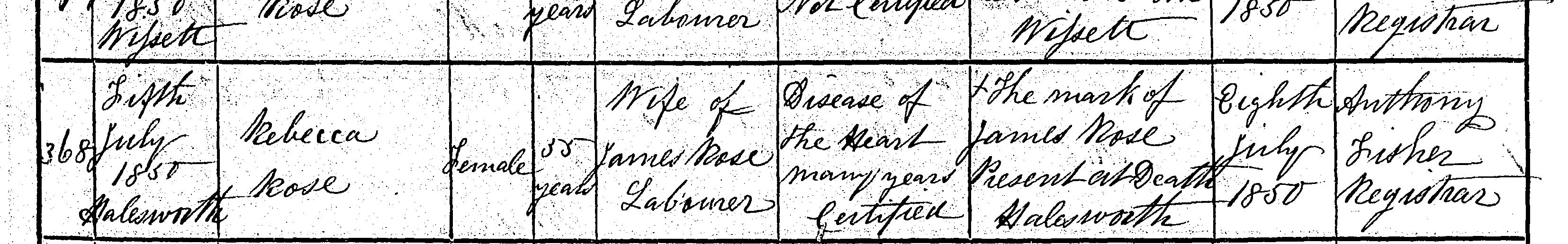 Death in the Registration District of Blything, Suffolk, 1850, no. 368. Died 5 Jul 1850 at Halesworth; Rebecca Rose; Female; age 55; Wife of James Rose, Labourer. Cause of death: Disease of the heart, many years, certified. Informant was James Rose (could not sign name); relation: Not known; residing at Halesworth; present at death. The death was registered 8 Jul 1850.