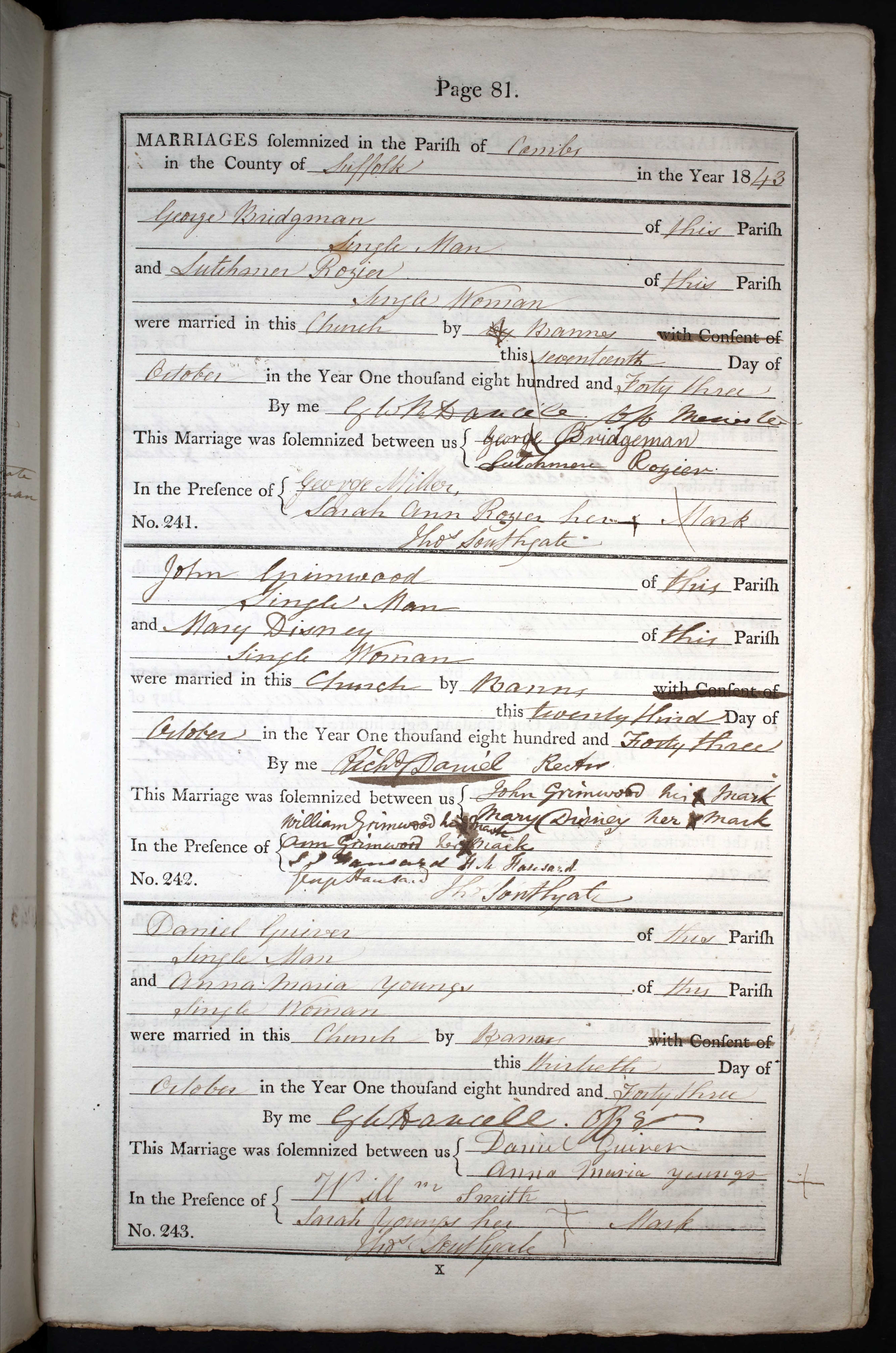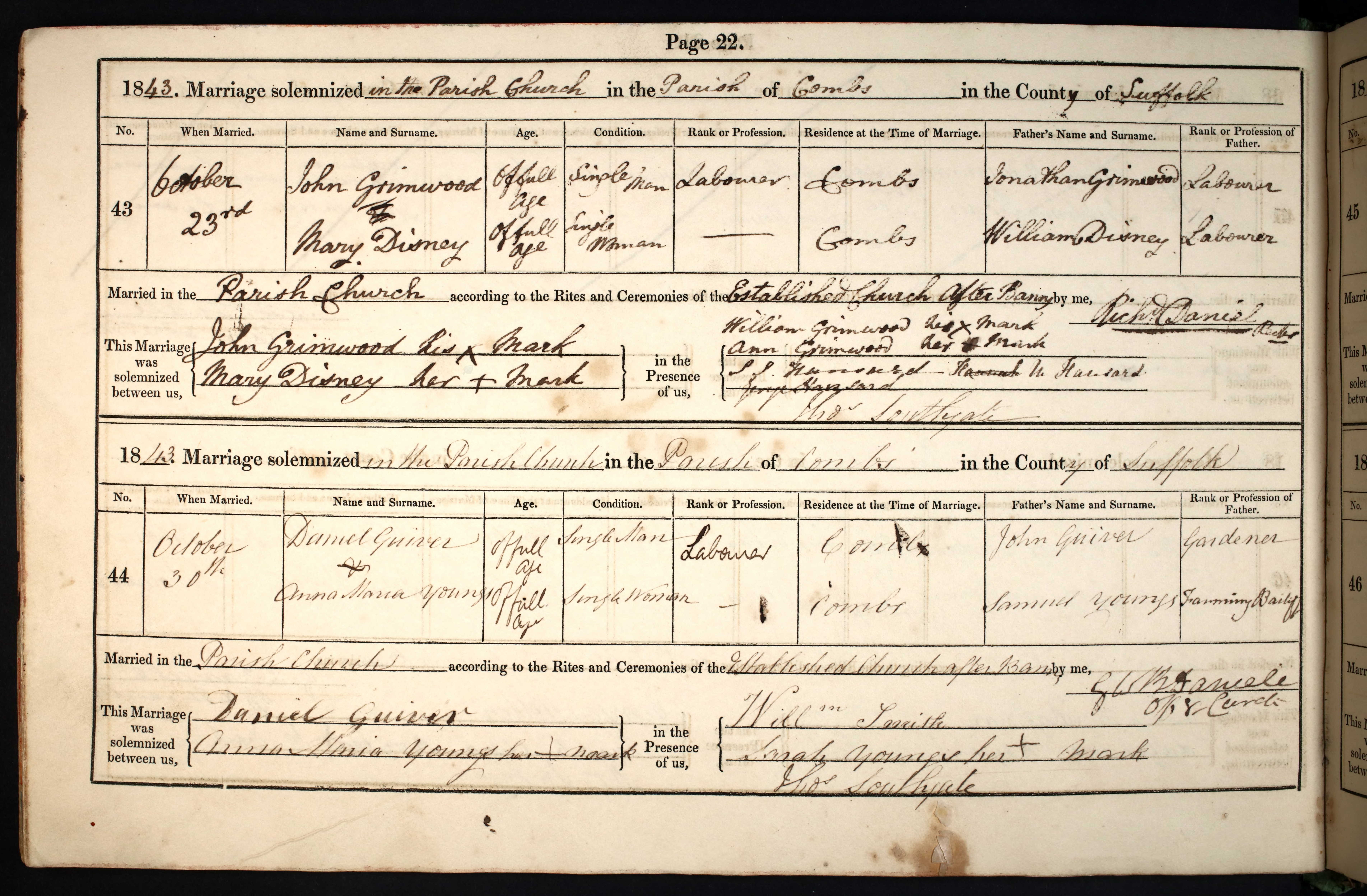 Parish Registers of St. Mary, Combs, Suffolk; Marriage entry for Daniel Guiver and Anna Maria Youngs, 31 Oct 1843, Page 22, No 44.