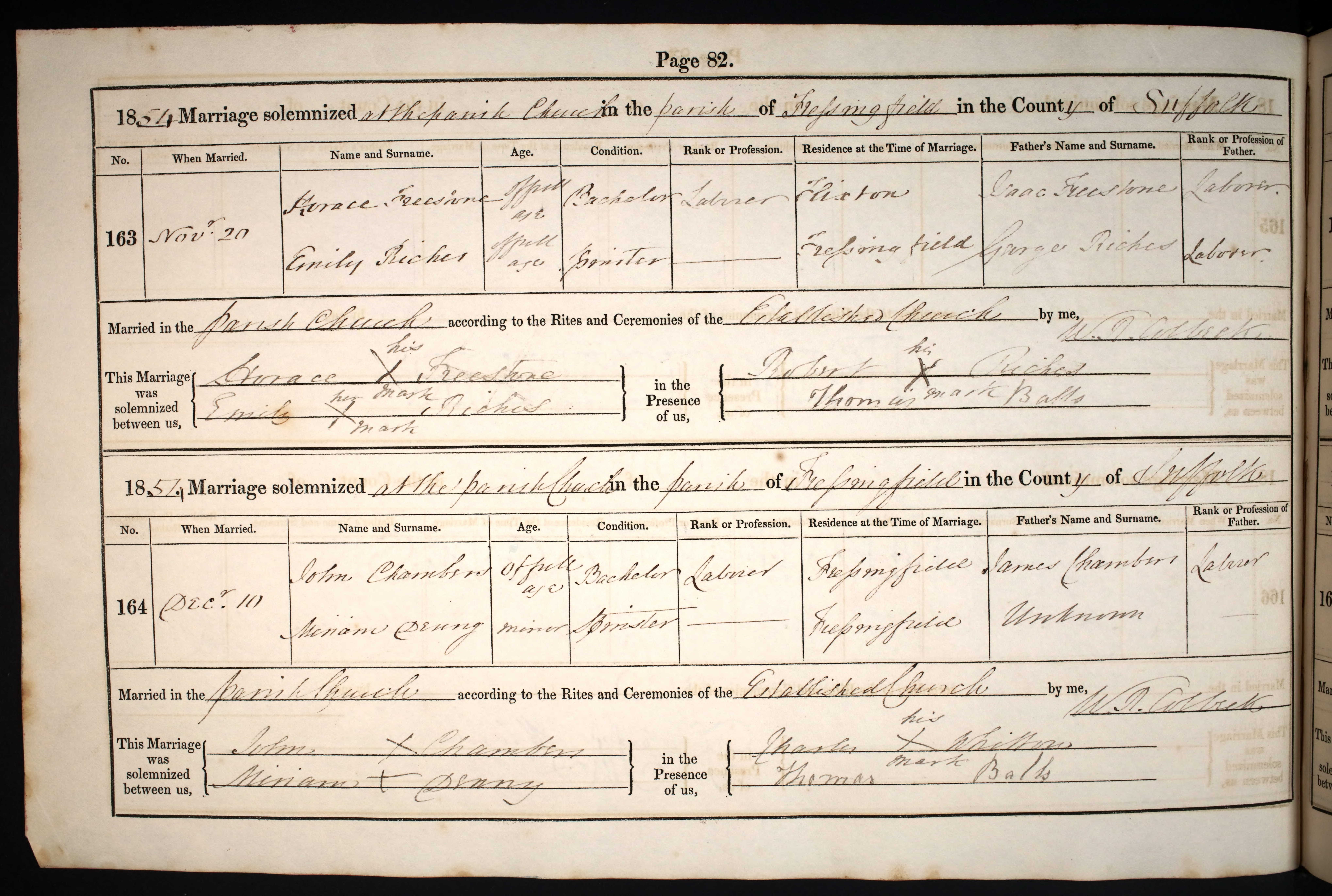 Parish Registers of St Peter & St Paul, Fressingfield, Suffolk; Marriage entry for John Chambers and Miriam Denny, 10 Dec 1854, Page 82, No 164.