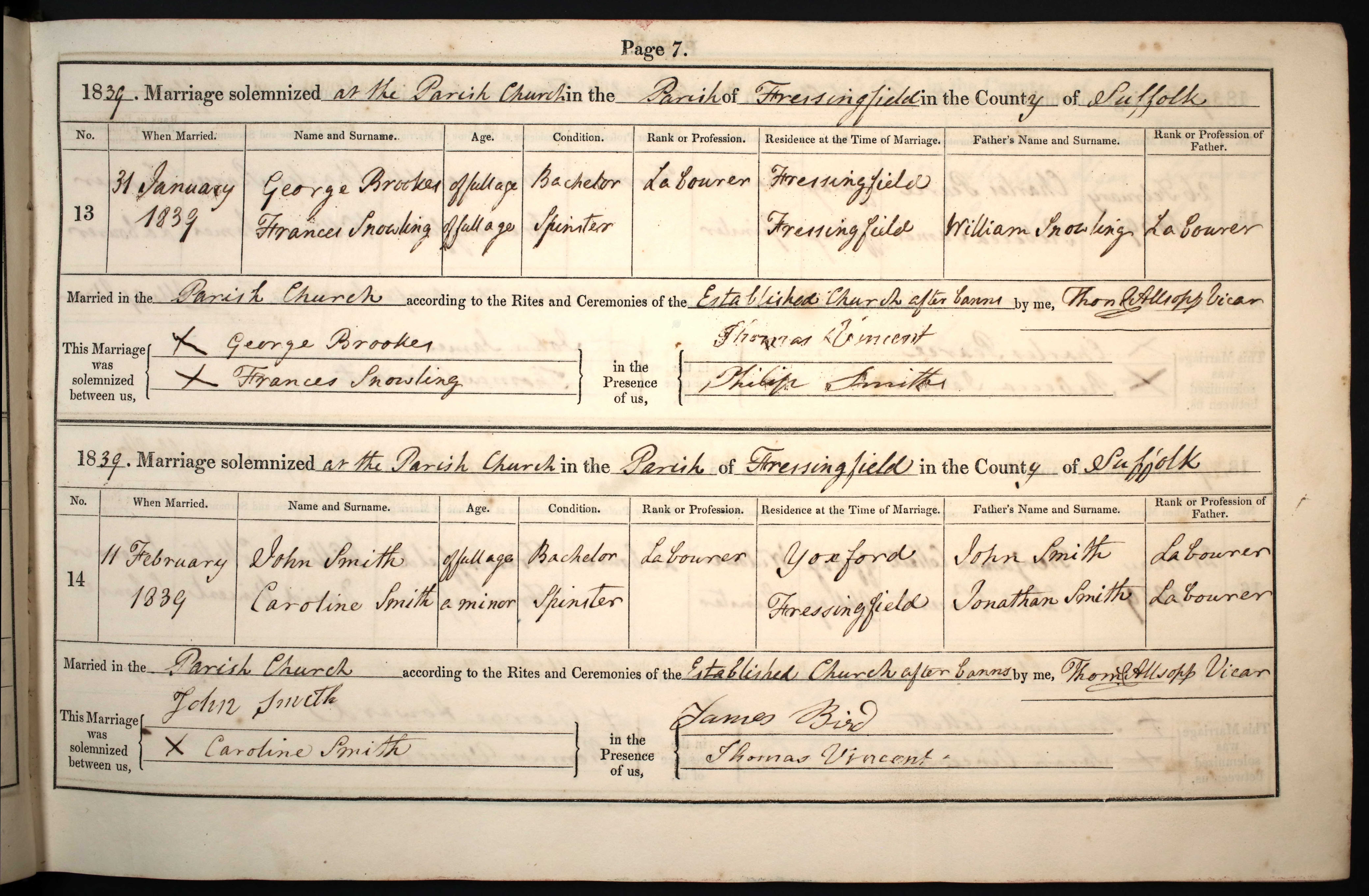 Parish Registers of St Peter & St Paul, Fressingfield, Suffolk; Marriage entry for George Brookes and Frances Snowling, 31 Jan 1839, Page 7, No 13.