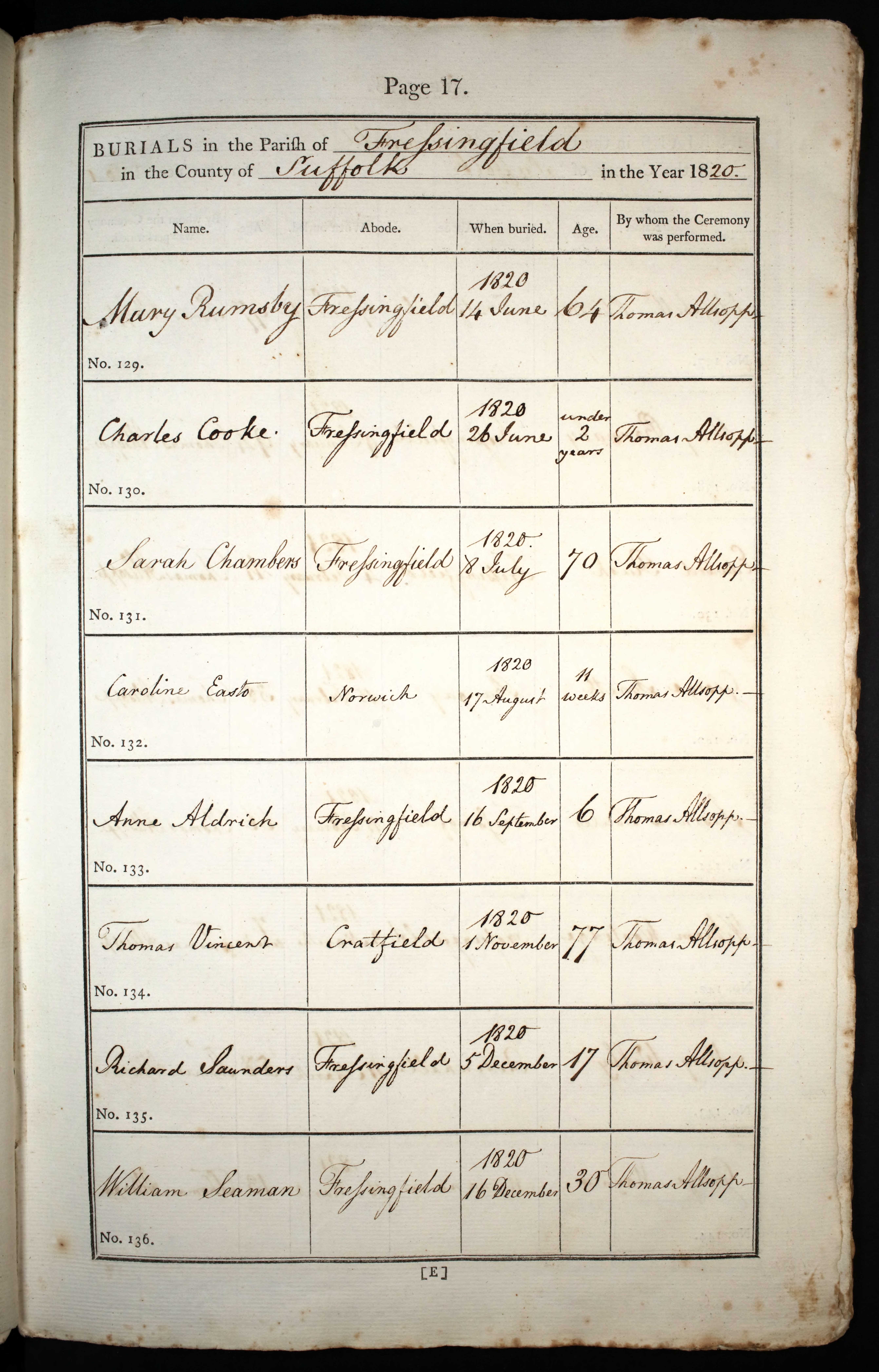 Parish Registers of St Peter & St Paul, Fressingfield, Suffolk; Burial entry for Sarah Chambers, 8 Jul 1820, Page 17, No 131.