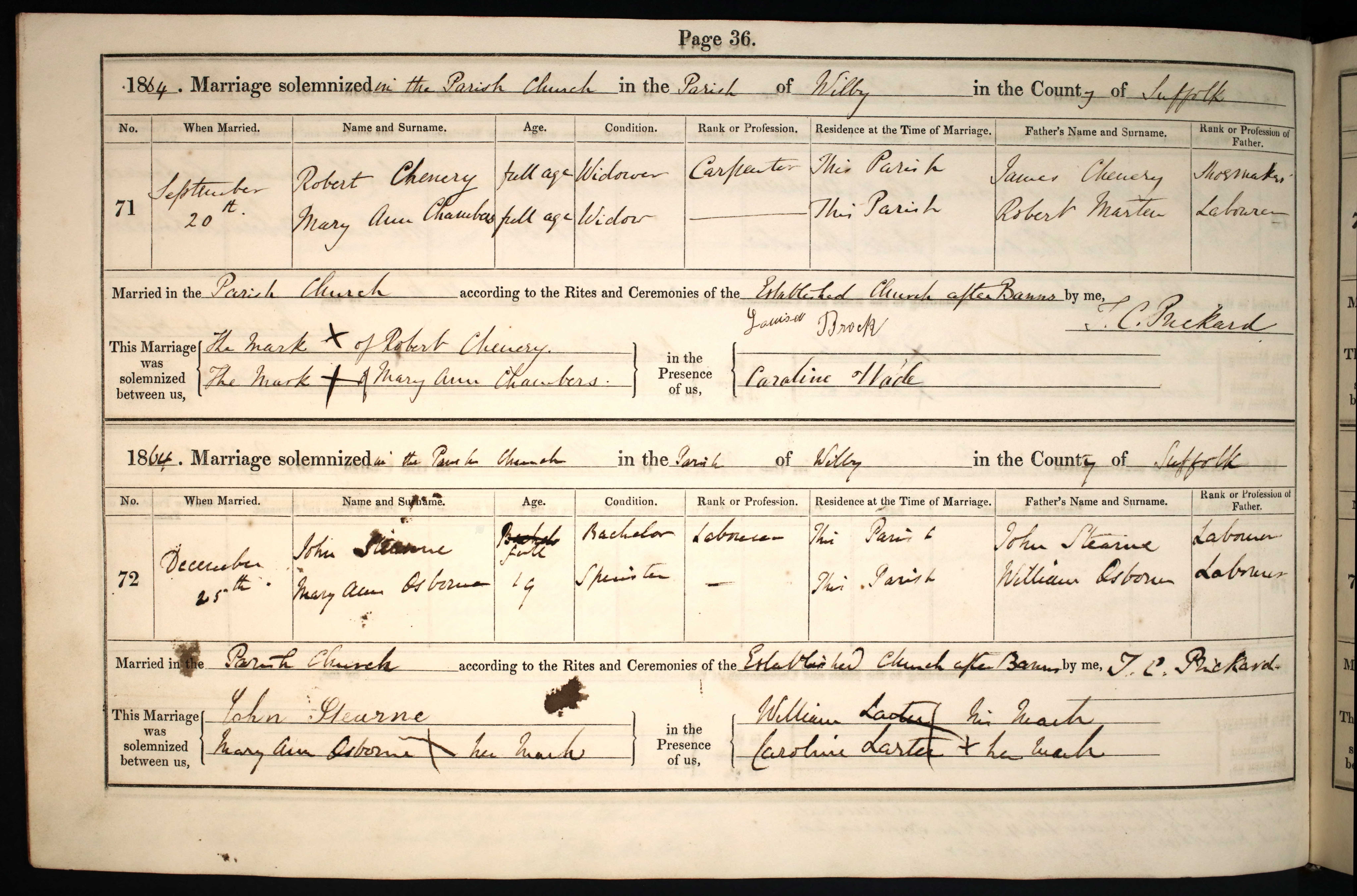 Parish Registers of St. Mary, Wilby, Suffolk; Marriage entry for Robert Chenery and Mary Ann Chambers, 20 Sep 1864, Page 36, No 71.