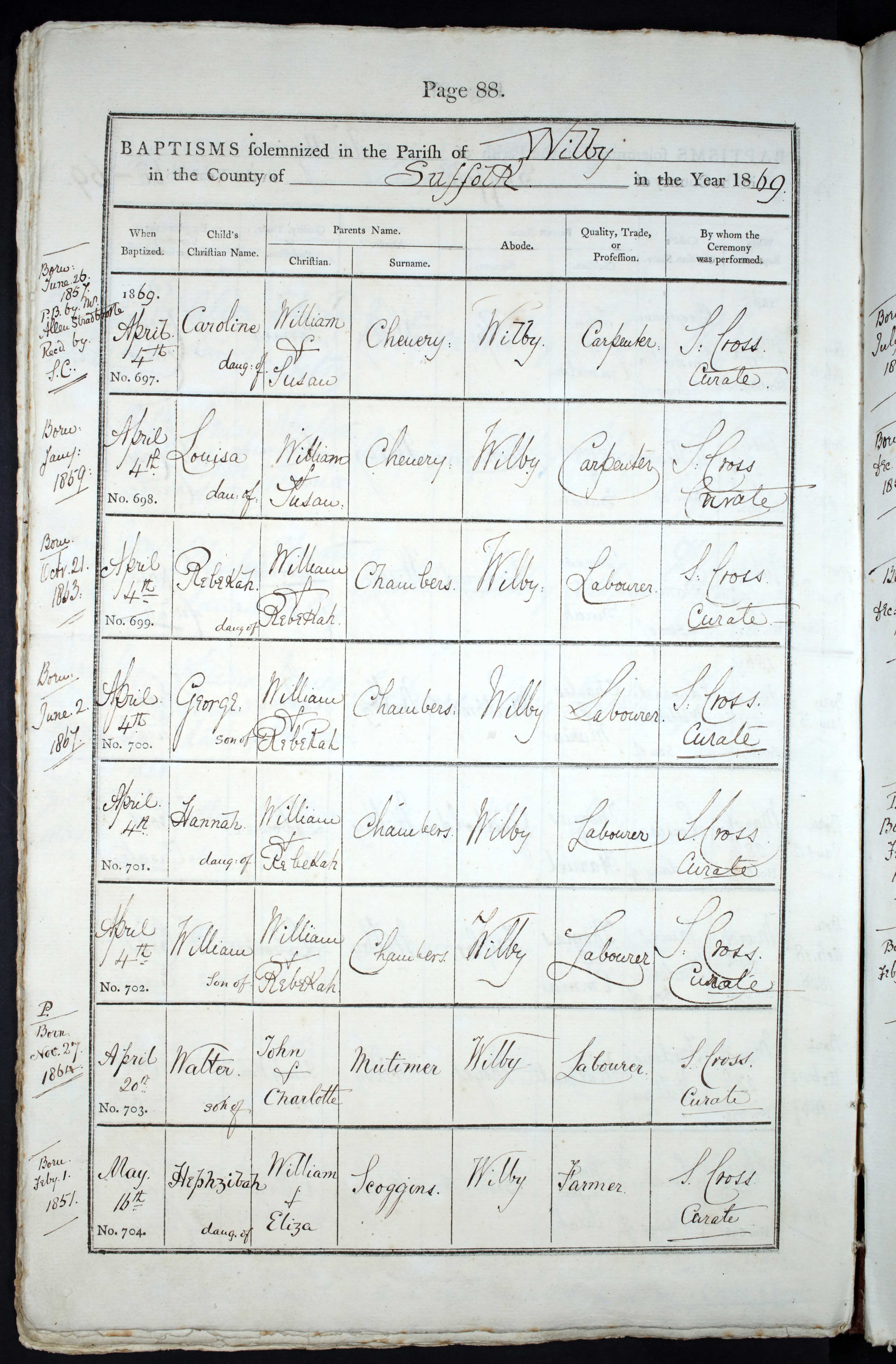 Baptism entry for Rebekah Chambers, 4 Apr 1869, No 699