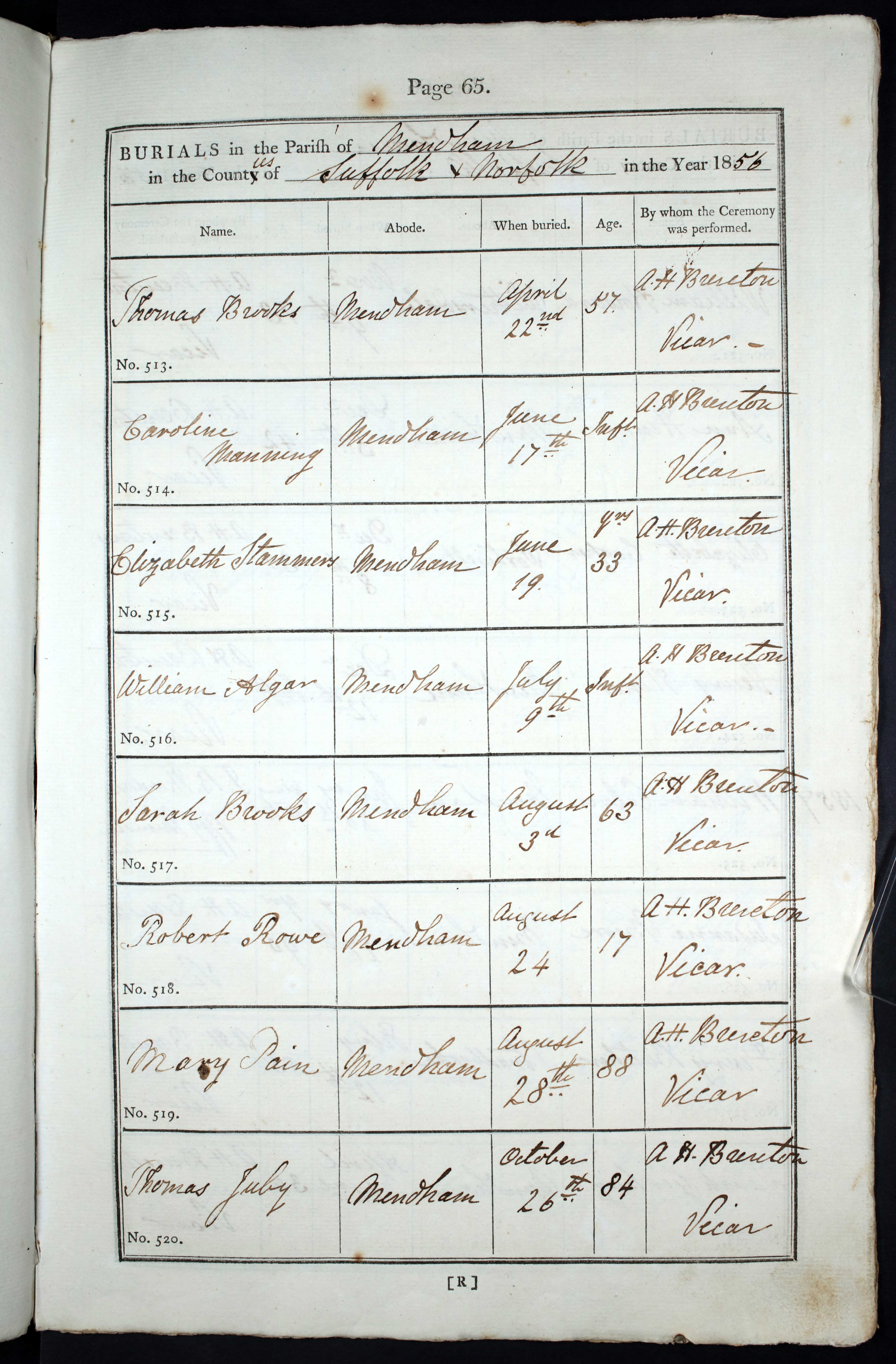 Parish Registers of All Saints, Mendham, Suffolk; Burial entry for Thomas Brooks, 22 Apr 1856, Page 65, No 513.