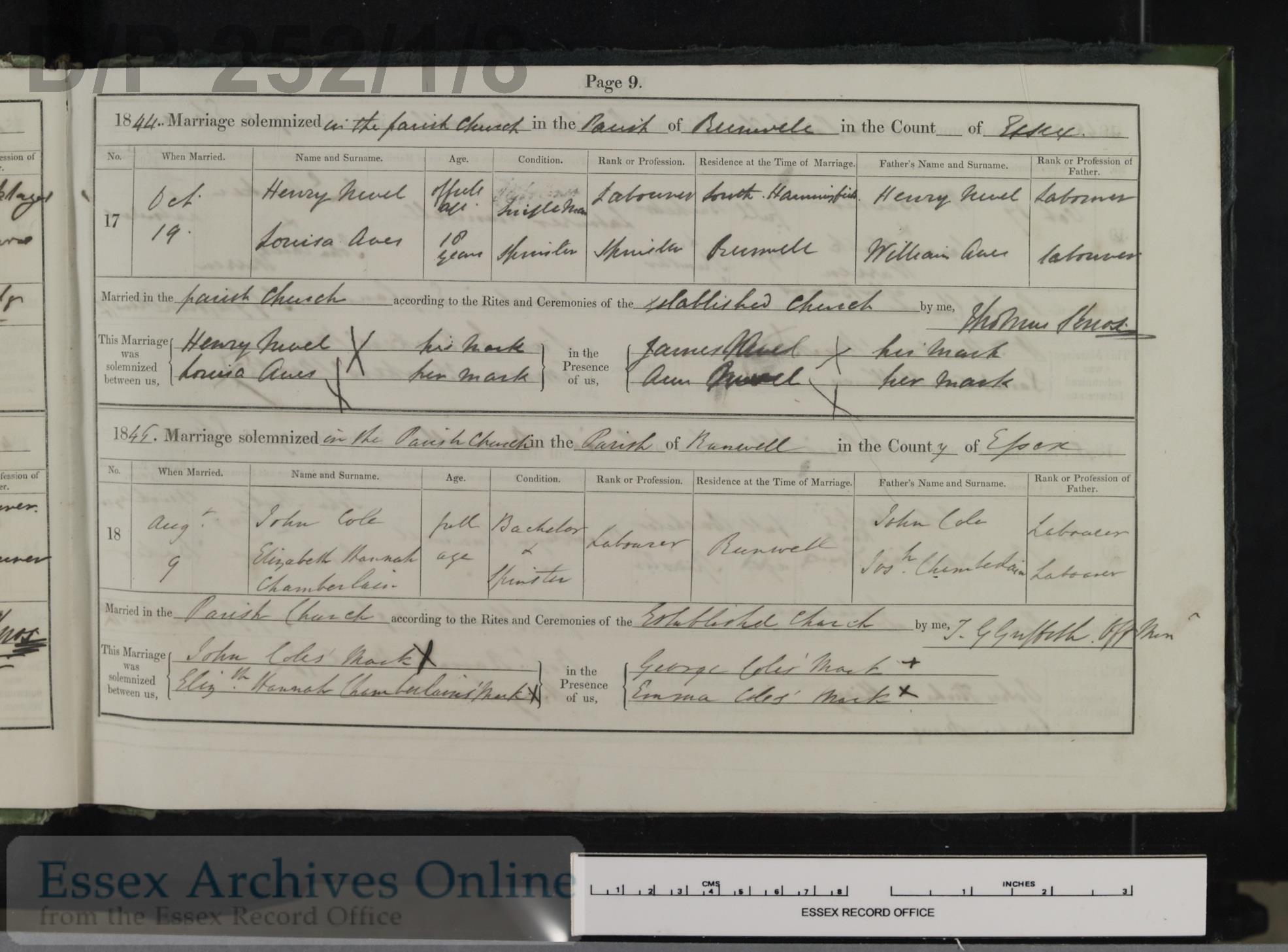 Parish Registers of St. Mary, Runwell, Essex, England; Marriage entry for John Cole and Elizabeth Hannah Chamberlain, 9 Aug 1845, Page 9, No 18.