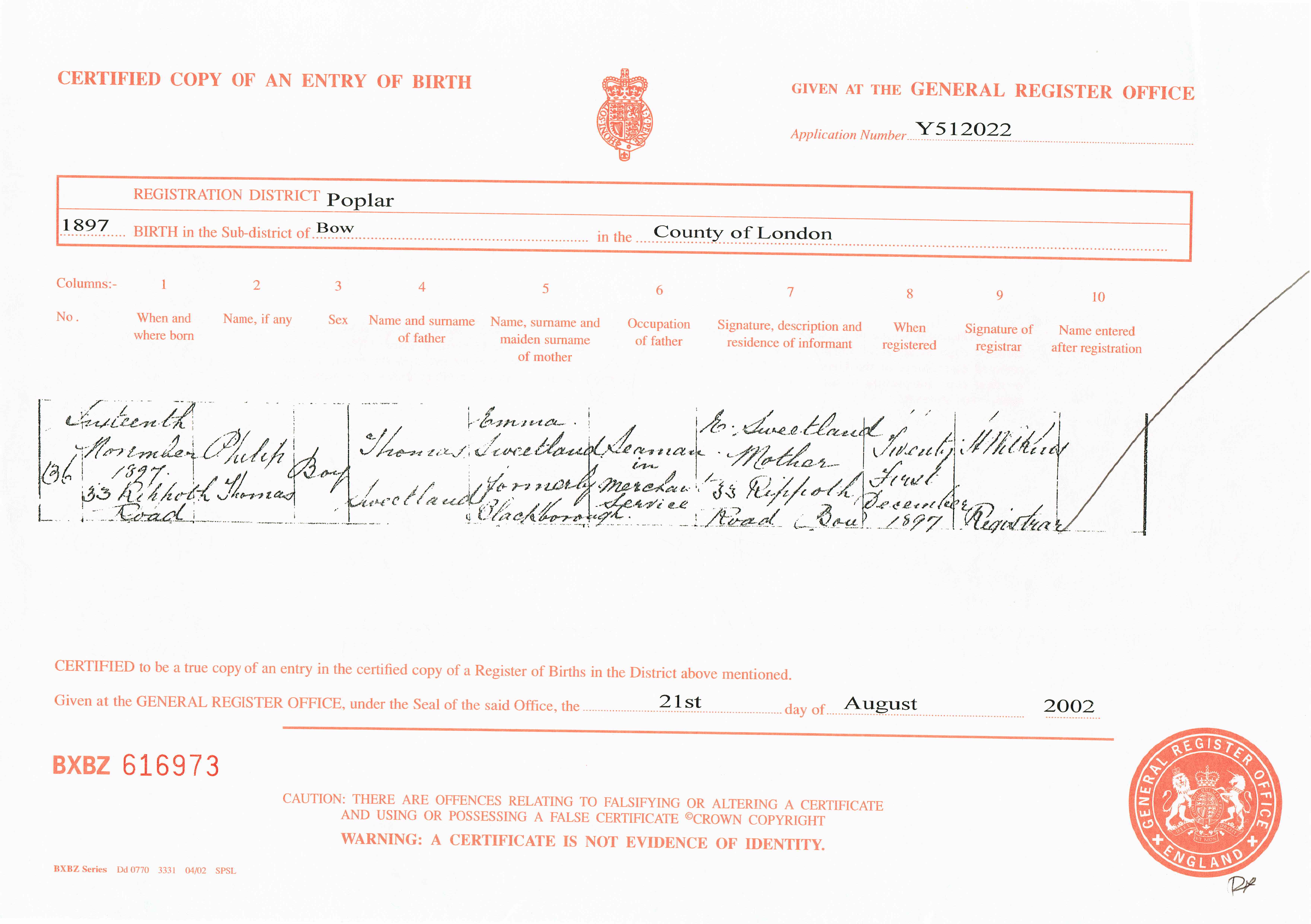 Birth in the Registration District of Poplar, Sub-district of Bow, London, 1897, no. 136. Born 16 Nov 1897 at 33 Rippoth Road; Philip Thomas Sweetland; Boy; father Thomas Sweetland; mother Emma Sweetland formerly Blackborough. Occupation of father: Seaman in merchant service. Informant was E Sweetland; Mother; 33 Rippoth Road, Bow; signed name. The birth was registered 21 Dec 1897.