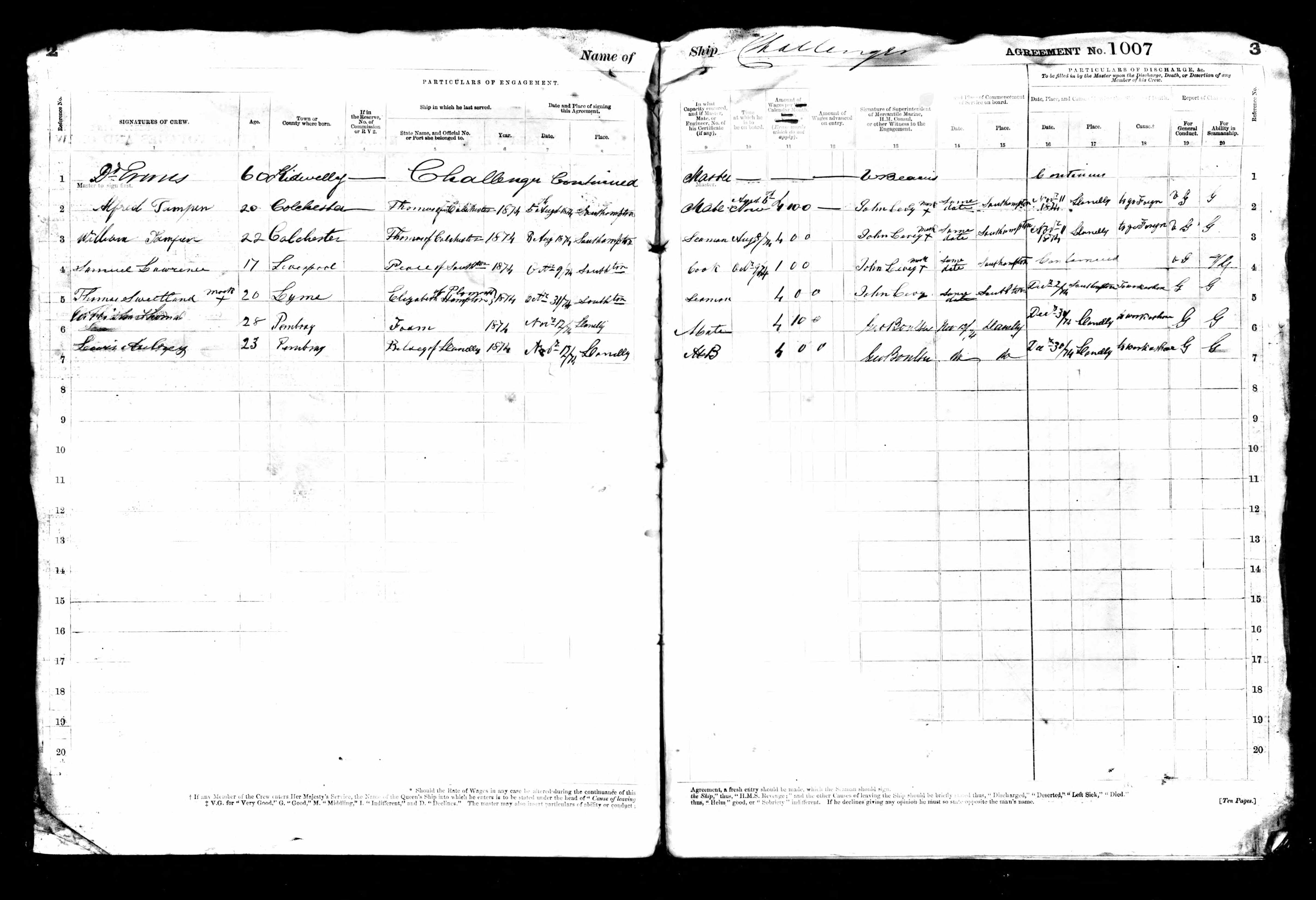 Agreements, Crew Lists and Muster Rolls of Merchant Vessels Registered at Irish Sea Ports 1850-1921; Crew List for Challenger, 1874, Thomas Sweetland, No 5.