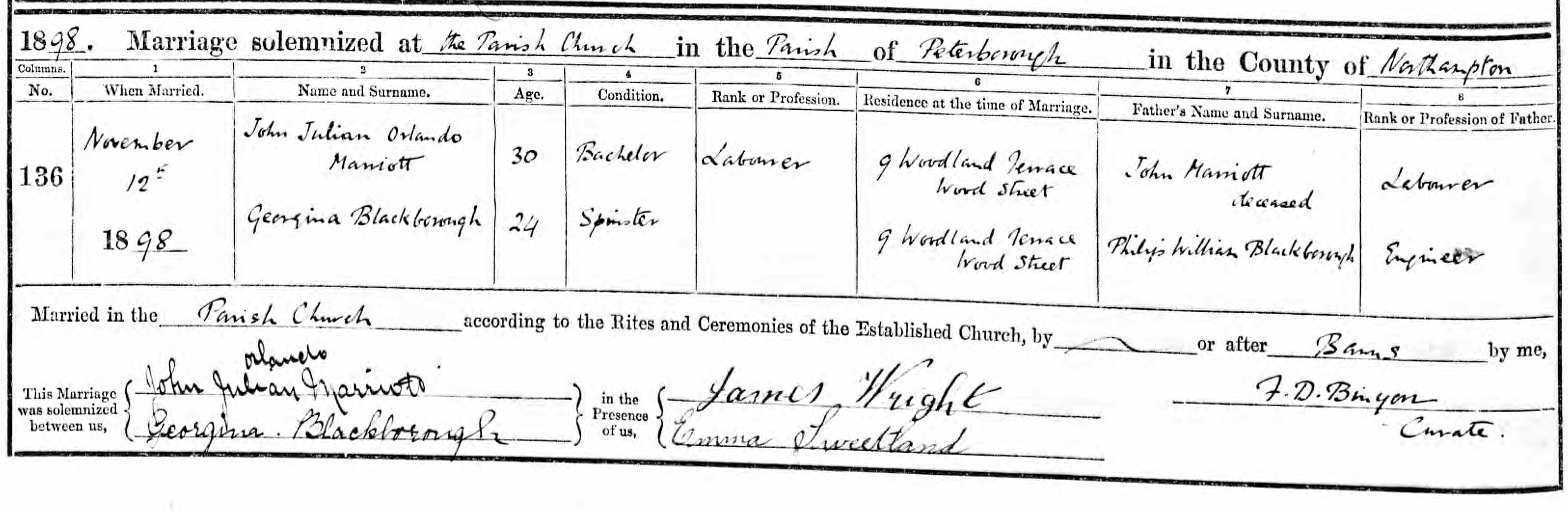 - John Julian Orlando Marriott and Georgina Blackborough was married on 12 Nov, 1898 at St. John's Church, Peterborough, Northamptonshire, England