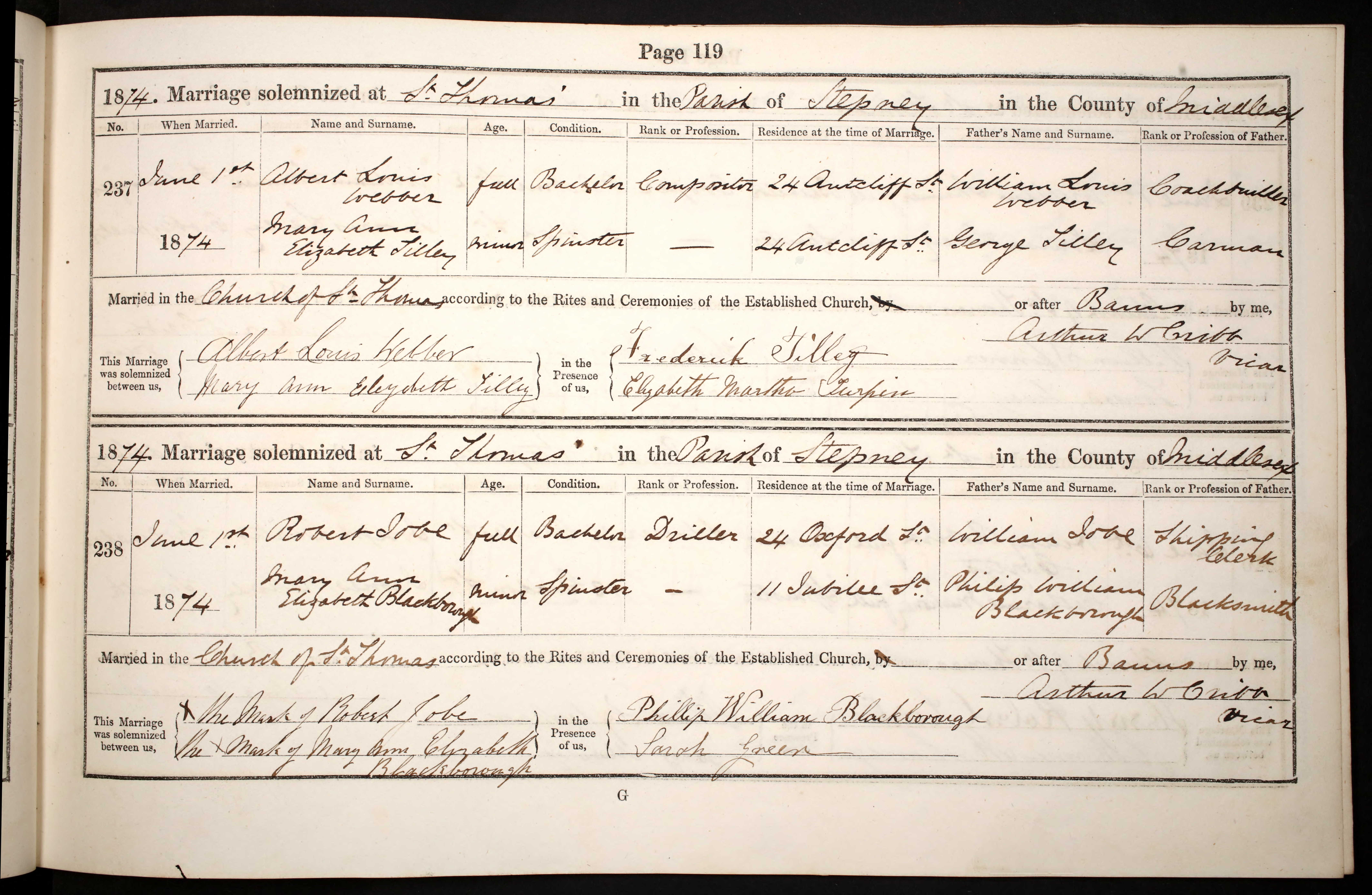 Parish Registers of St. Thomas, Stepney, Middlesex; Marriage entry for Robert Jobe and Mary Ann Elizabeth Blackborough, 1 Jun 1874, Page 119, No 238.