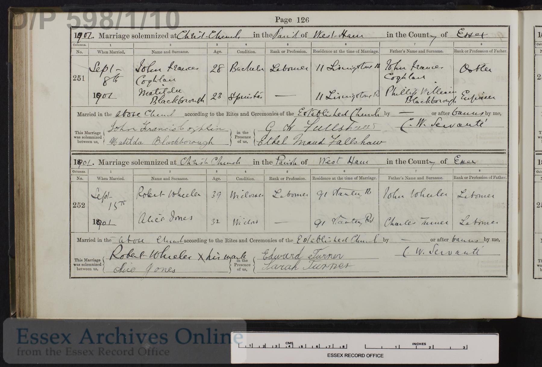Parish Registers of Christ Church, Stratford, Essex; Marriage entry for John Francis Coghlan and Matilda Blackborough, 8 Sep 1901, Page 126, No 251.
