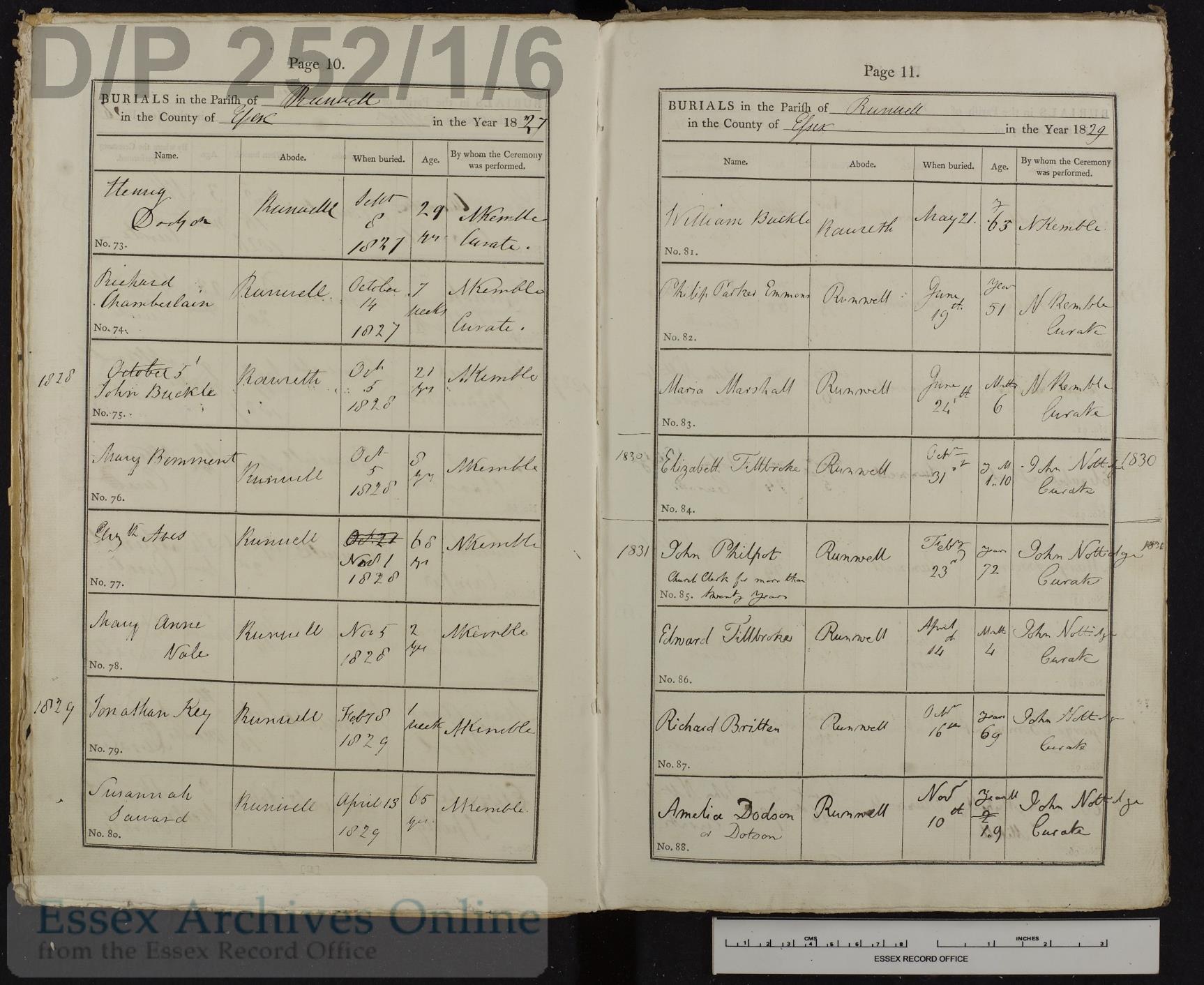 Parish Registers of St. Mary, Runwell, Essex, England; Burial entry for Richard Chamberlain. 14 Oct 1827, Page 10, No 74.