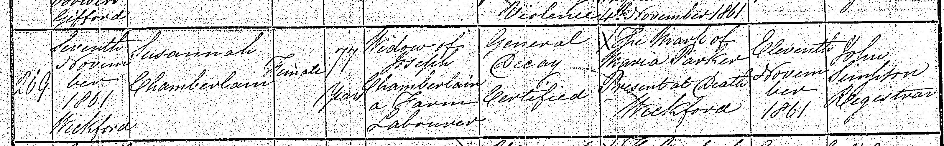 Death in the Registration District of Billericay, Essex, 1861, no. 269. Died 7 Nov 1861 at Wickford; Susannah Chamberlain; Female; age 77; Widow of Joseph Chamberlain, a farm labourer. Cause of death: General Decay, certified. Informant was Maria Parker (could not sign name); relation: Not known; residing at Wickford; present at death. The death was registered 11 Nov 1861.