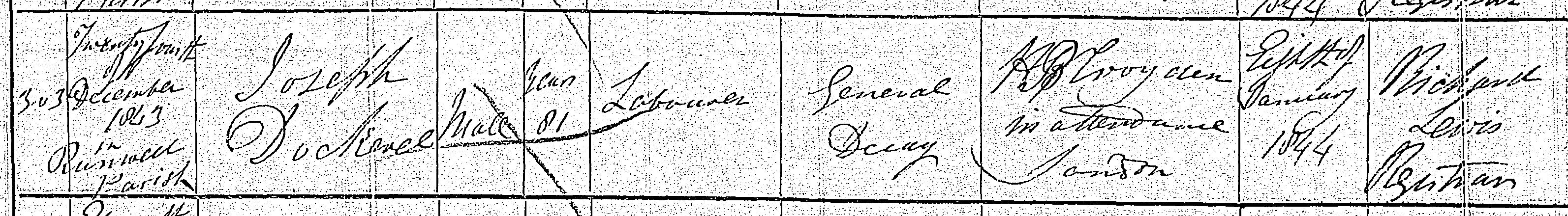Death in the Registration District of Chelmsford, Essex, 1844, no. 303. Died 24 Dec 1843 at Runwell Parish; Joseph Dockerel; Male; age 81; Labourer. Cause of death: General Decay. Informant was [J Croydon?] (signed name); relation: Not known; residing at London; present at death. The death was registered 8 Jan 1844.