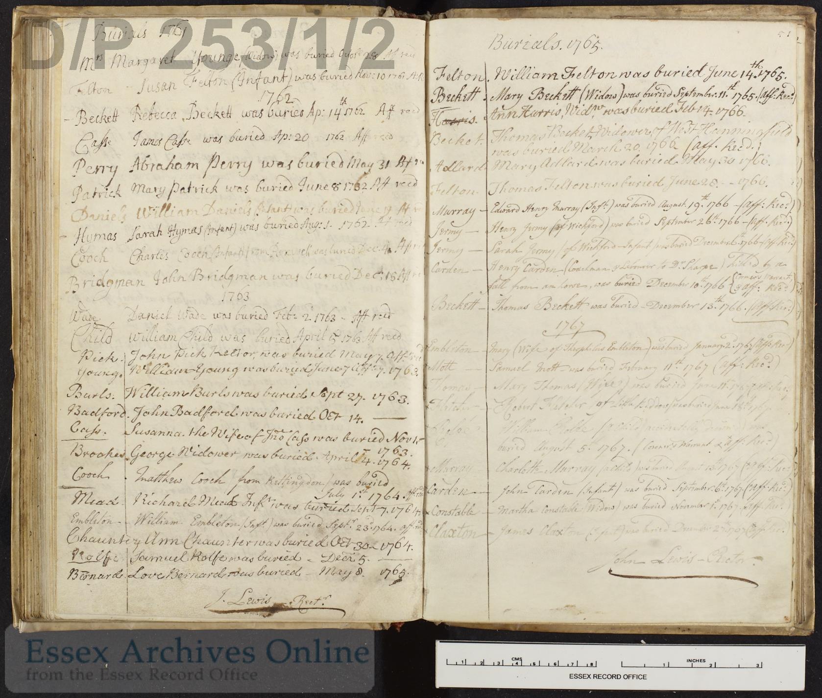 Parish Registers of St. Andrew, Sandon, Essex; Burial entry for Susan Felton, 10 Nov 1761.