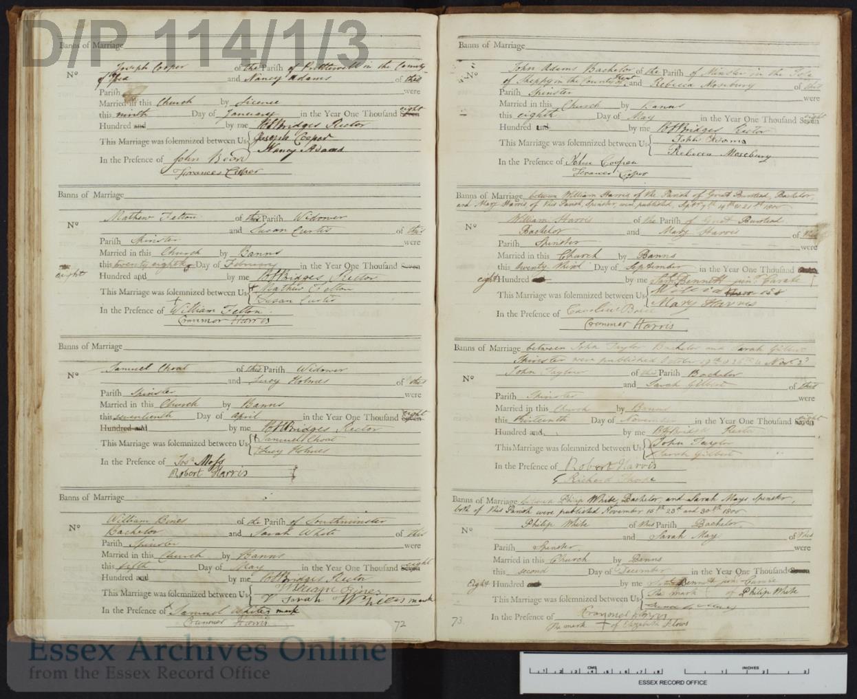 Parish Registers of St. John the Baptist, Danbury, Essex, England; Marriage entry for Matthew Felton and Susan Curtis, 28 Feb 1800.